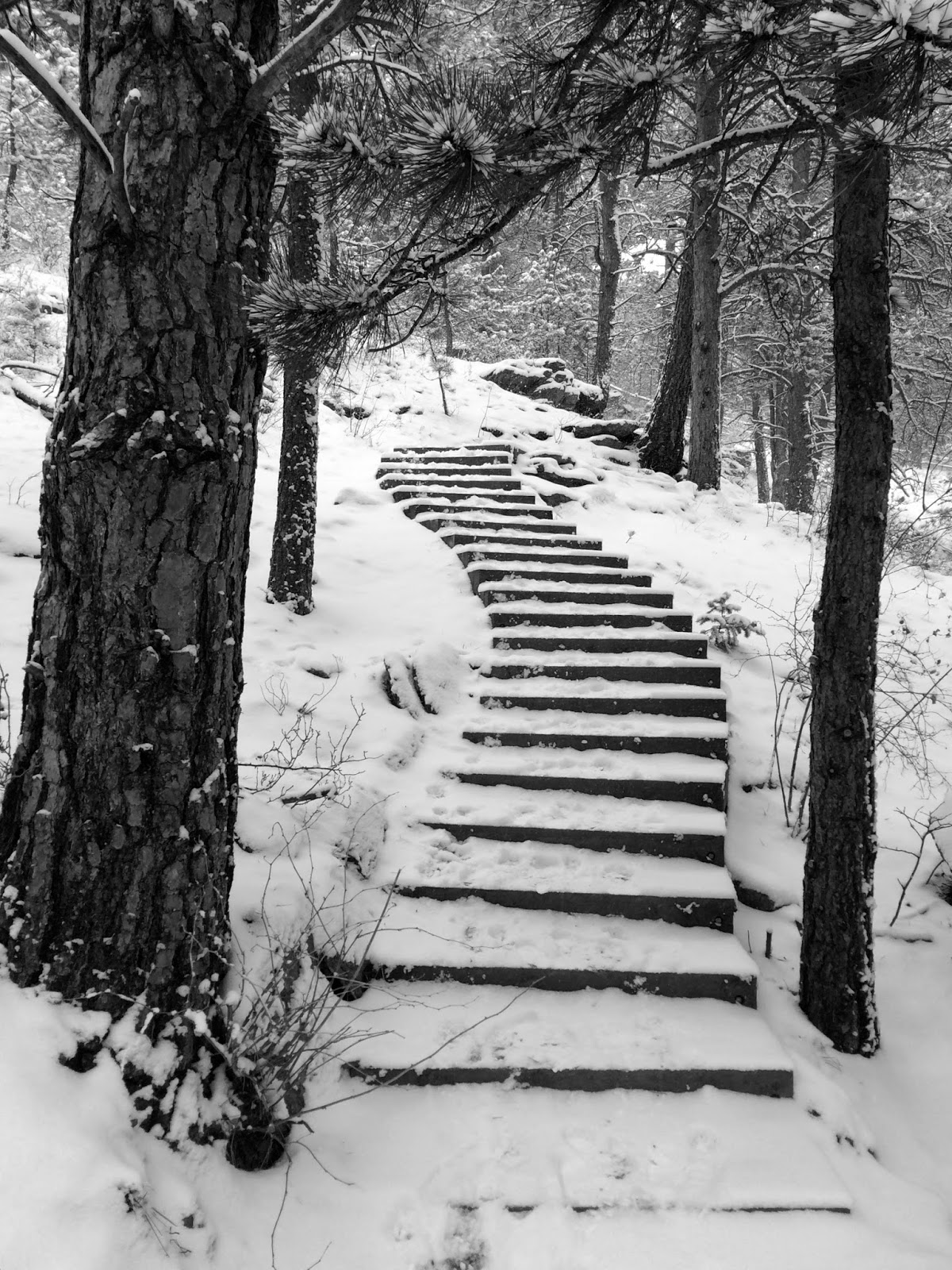 Howling like a ghostly demon, the relentless wind chased us down into the brooding forest. The mysterious sanctuary was a tangle of gnarled tree trunks and broken limbs. Confined to a murky chasm during the December dusk, a daunting staircase was the only way out.