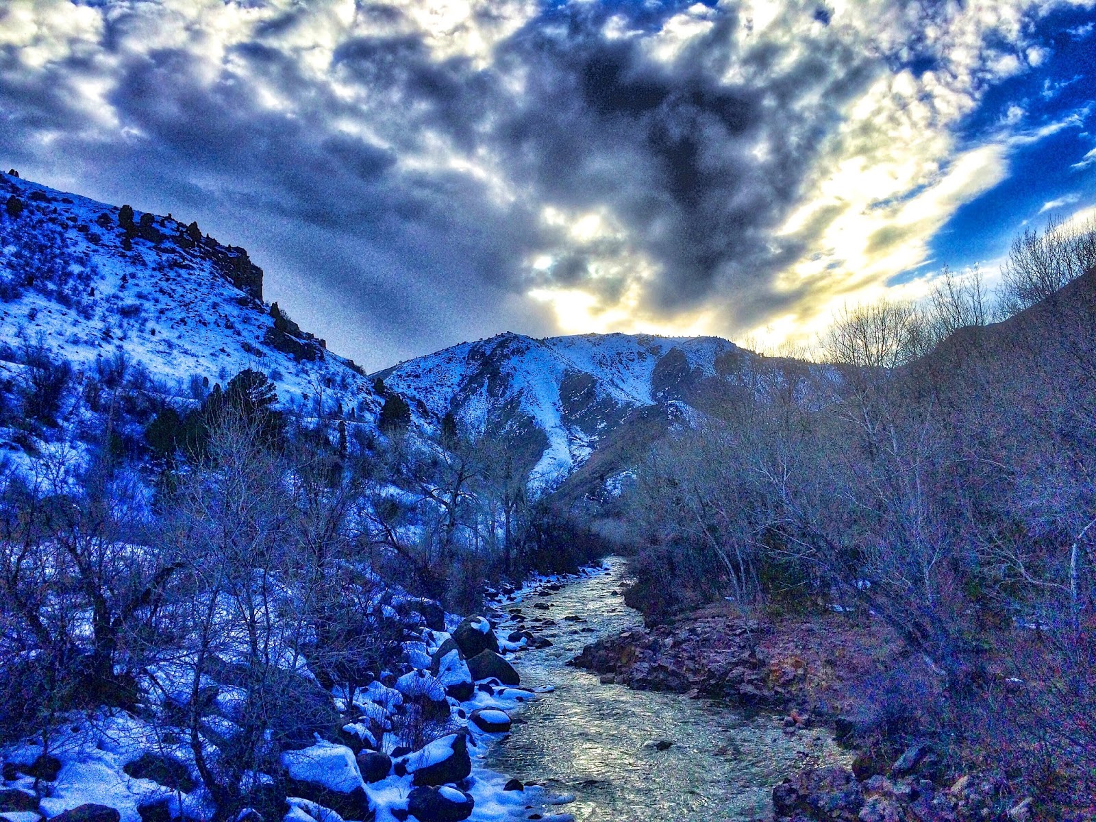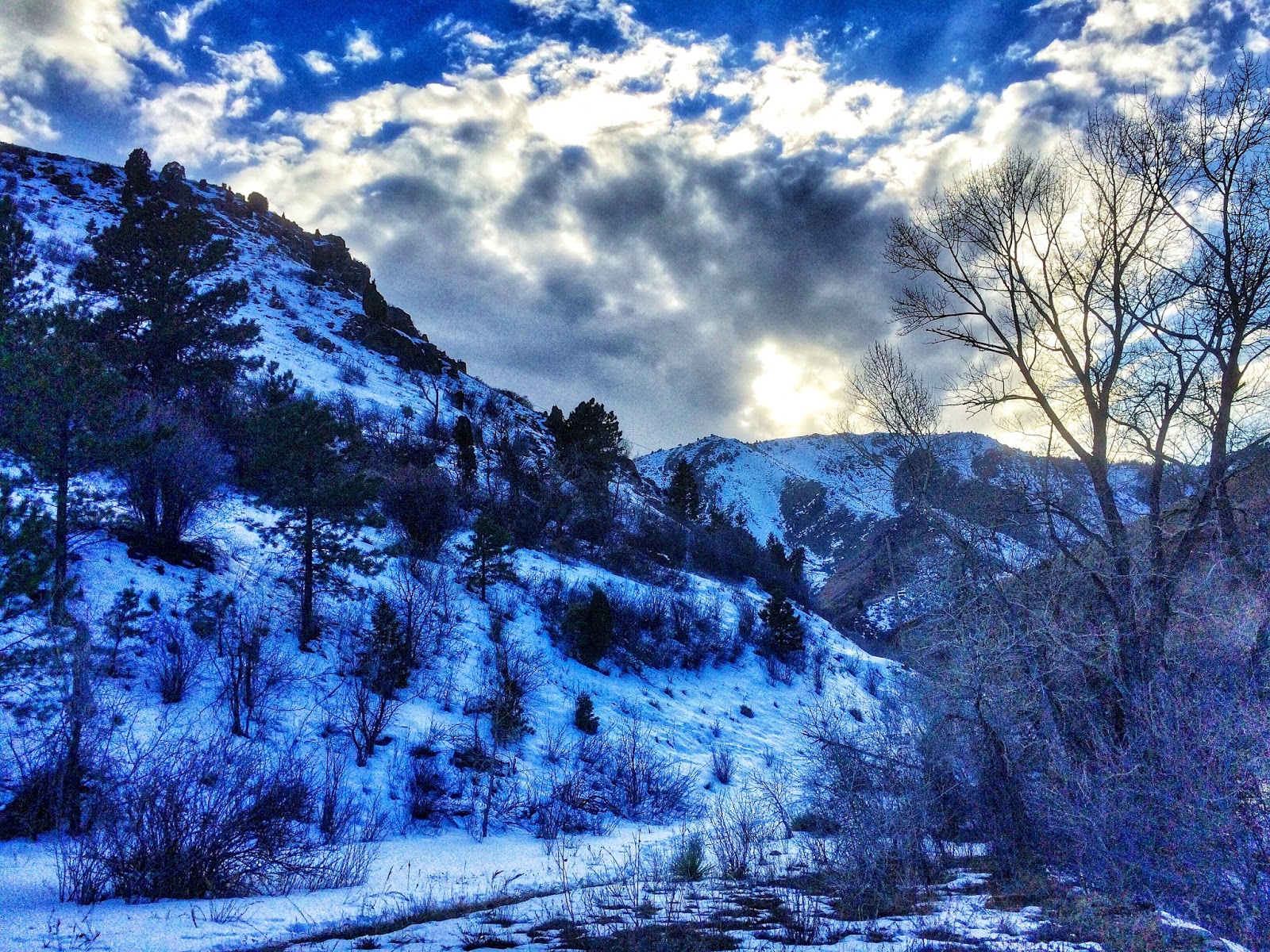Packed with deep snow, the canyon trail is mired in an eternal shadow. Backlit beneath billowy clouds, the blue mountains remain anything but glum. A cheerful spirit permeates the entire landscape.