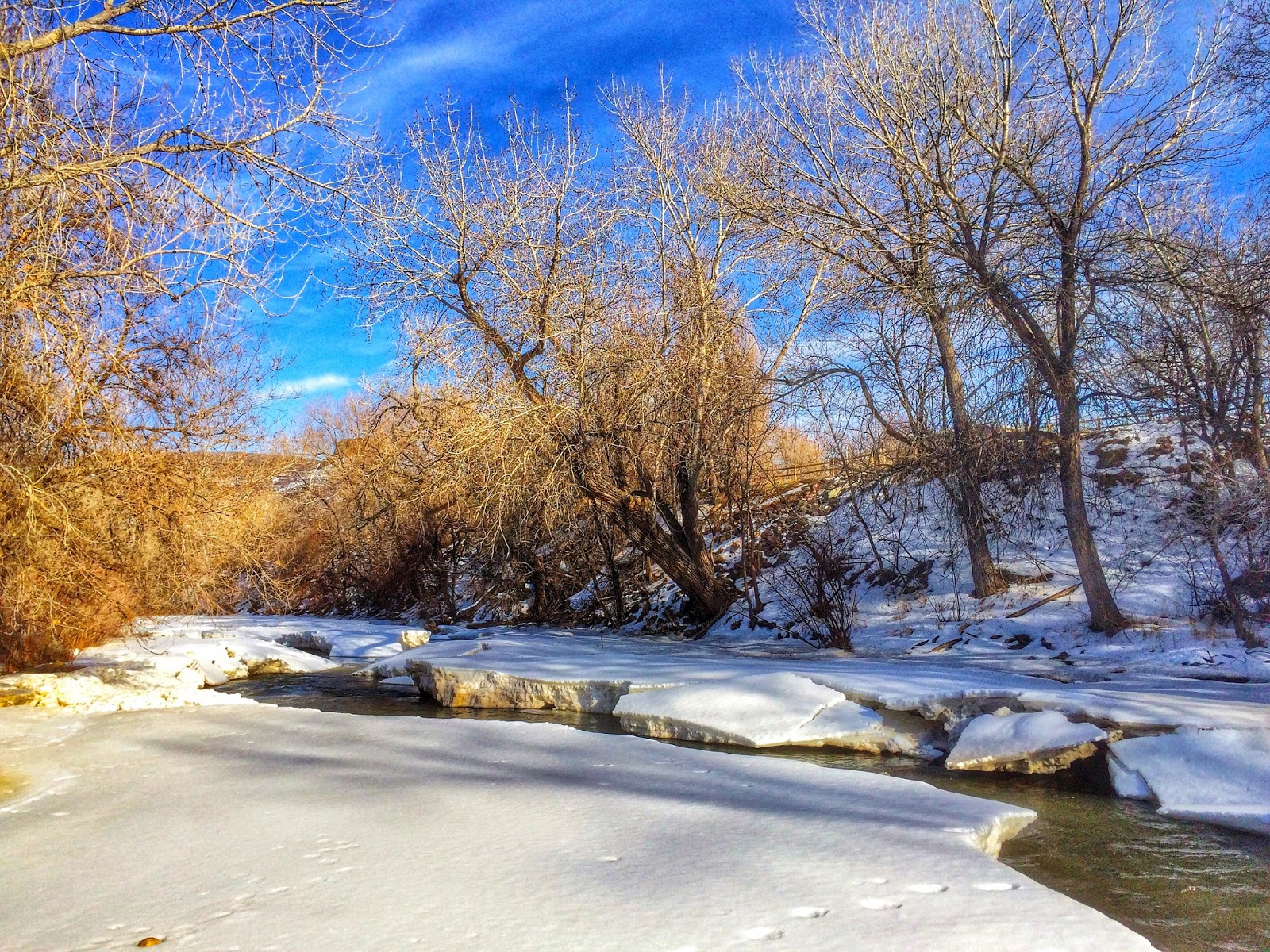 The great thaw continues and soon this silent stream will be transformed into a transparent torrent, flowing below a series of rustic bridges. Off towards the setting sun, a deep gorge was hewn by this wonderful waterway.