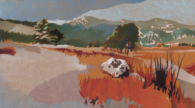 The big mountain in the background is drawn with a bumpy line and tinted a verdant gray. Frosted with sparkling white, the summit’s complex contour is clarified by sun and shade.