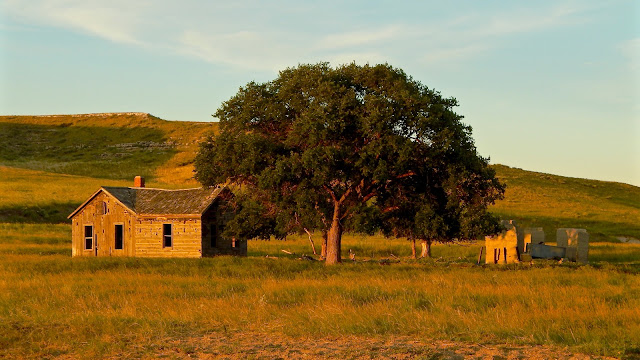 As the setting sun drenches the landscape with golden light, a rickety windmill still works but the rest of the neglected grounds is in ruins. A rare spectacle in the vast sandhills, the big tree looks to be in vigorous shape.