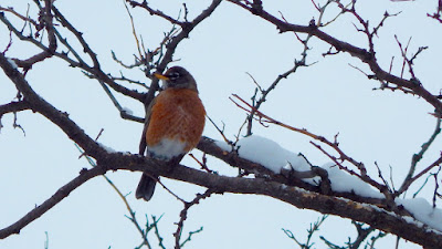 The return to the roadside was a gloomy venture provoked by bitter cold. Along the way, a cheerful robin singing in the tangled brush was a surprising ray of hope that brightened the dreary day - spring may actually be closer than it appears.