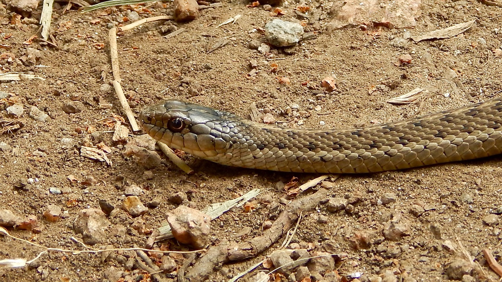 My first reaction was to recoil in fear. Surprised to see a snake at this elevation, we cautiously observed the reptile for a little bit. He was about two feet long and a striking yellow-gray in color with dark patterns. He appeared fairly harmless.