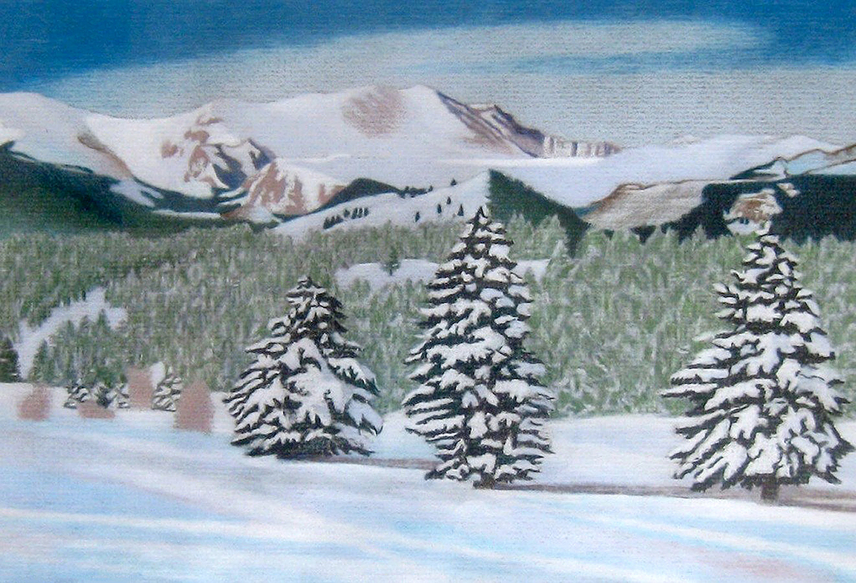 It's a cold, windy day on Upper Bear Creek. Mount Evans is buried under a blanket of fresh snow. The sturdy evergreens are built to withstand winter storms like this. Heavy snow clings to the blue spruce creating an interesting pattern of dark and light. The landscape is expressed with mostly cool blues and greens but there are some pinks and yellows woven into the foreground. Being outside on a morning like this can be uncomfortable, although the mountain scenery is a beautiful reward.