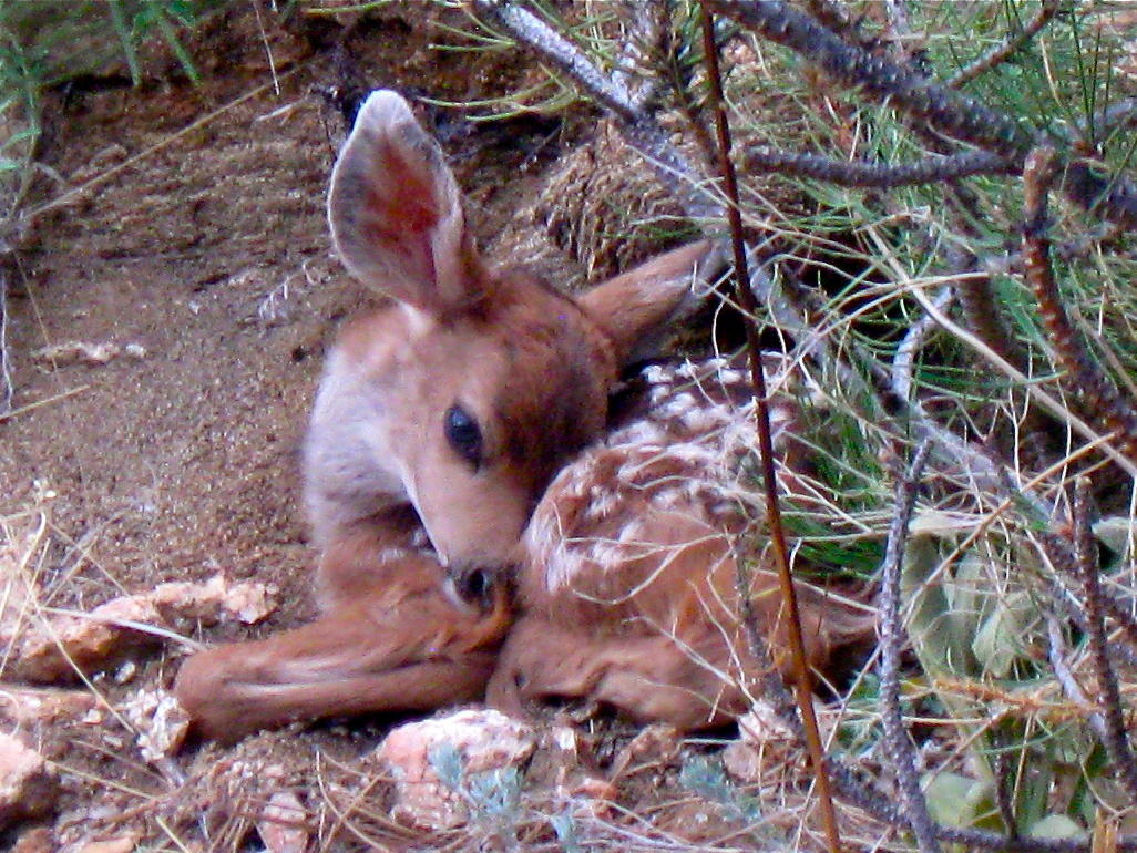 One of the things I love about living in the mountains is observing the wildlife. We routinely see elk and deer grazing in the townsite. The highlight of every spring is the mule deer doe that comes back to the yard and gives birth to twin fawns. They must feel safe in this locale because they hang out here all summer long.