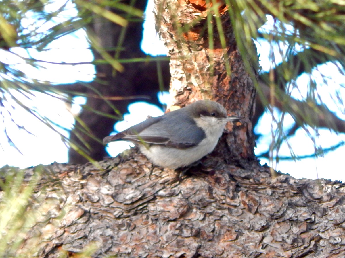 The pygmy nuthatch is an energetic, little songbird that lives in old, ponderosa pine tree forests. They twitter about the trunks and branches searching beneath the bark and in needle clusters for insects and seeds. Sometimes they even creep along the tree upside down just like the bigger nuthatches.