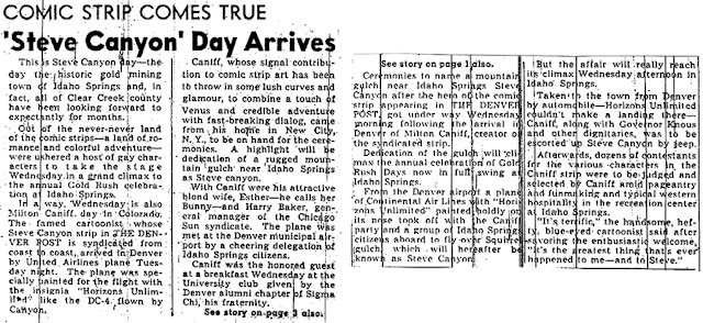 ReplyDeleteI'd seen the statue in Idaho Springs a few times but I didn't understand who it was. I did some research and thought the story was kind of interesting. I've never seen a Steve Canyon comic but I guess it was pretty big during its heyday. The artist, Milton Caniff is really good too.
