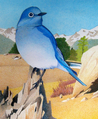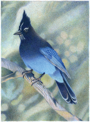 Whether an artist is striving for photo-realism or a more abstract representation, I've found that colored pencils are well suited to handle either request. I prefer a restrained composition with subtle hues and soft edges to express a tranquil mood. Starting with a sheet of textured paper, I begin drawing the eyes first and work outwards from there. Next, using an impressionistic application, the color is built up patiently, through multiple, transparent layers. Finally, when completed, I hope my sincere enthusiasm for our feathered friends shows through and inspires others to appreciate birds as much as I do.
