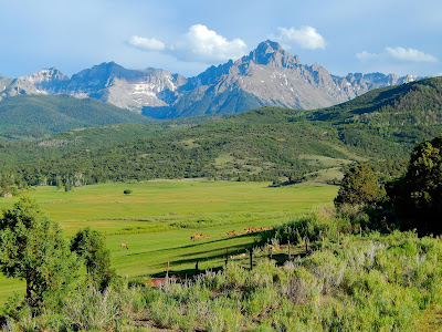 At the Dallas Divide, a restrained landscape of lower hay fields gives way to riotous slopes of quaking aspen and colorful wildflowers. Rising above tree line is a sweep of rugged terrain composed of banded layers of rock, steep crags and serrated ridges. Positioned majestically amongst these enormous peaks is the "Queen of the San Juans".