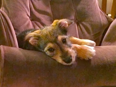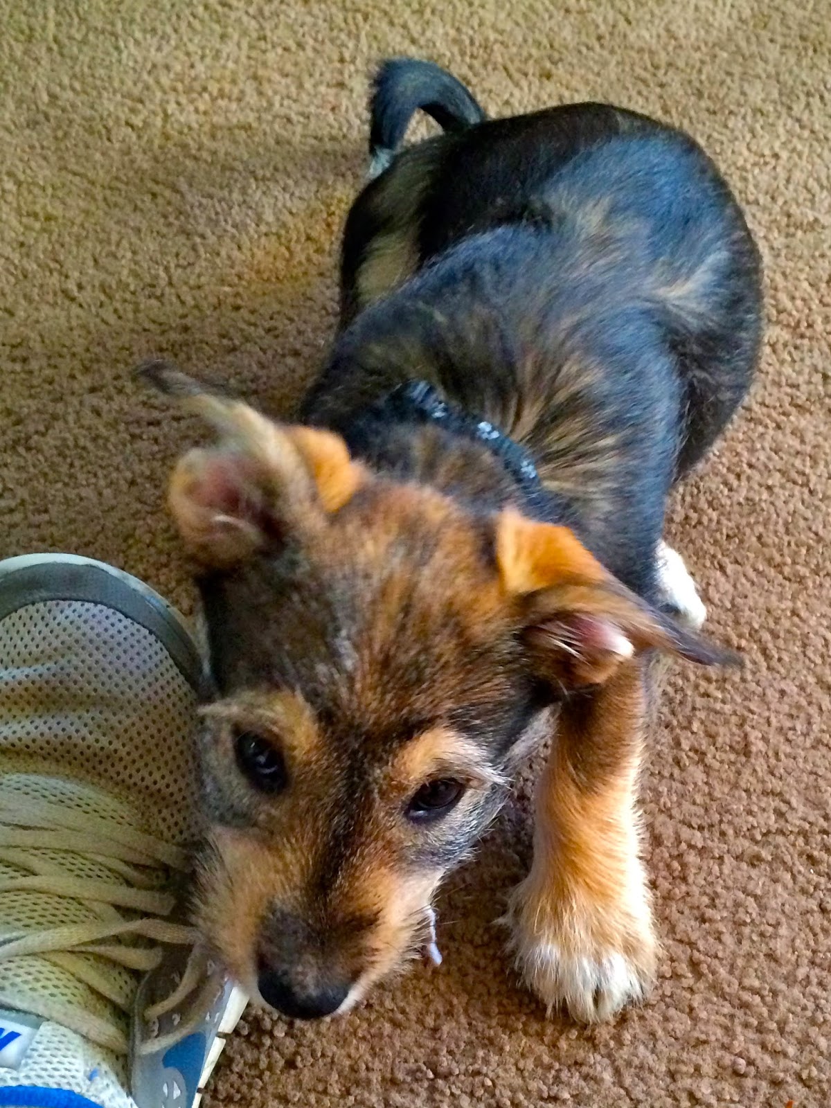 Welcome to the family, Oskar the Schnorgi. He's a two-month-old Miniature Schnauzer / Pembroke Welsh Corgi mix. We got him from up on the Willow Creek Ranch. He's an extremely affectionate lap dog with a playful personality. Hypoallergenic and non-shedding, our little designer breed has made himself right at home. Here we go again. Happy birthday to me.