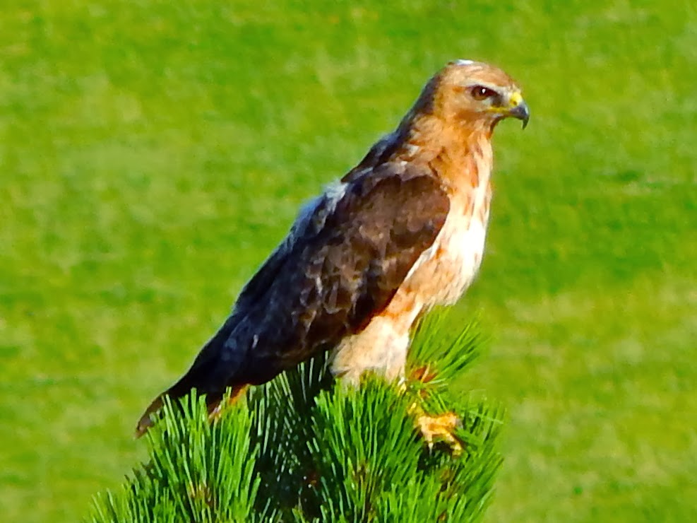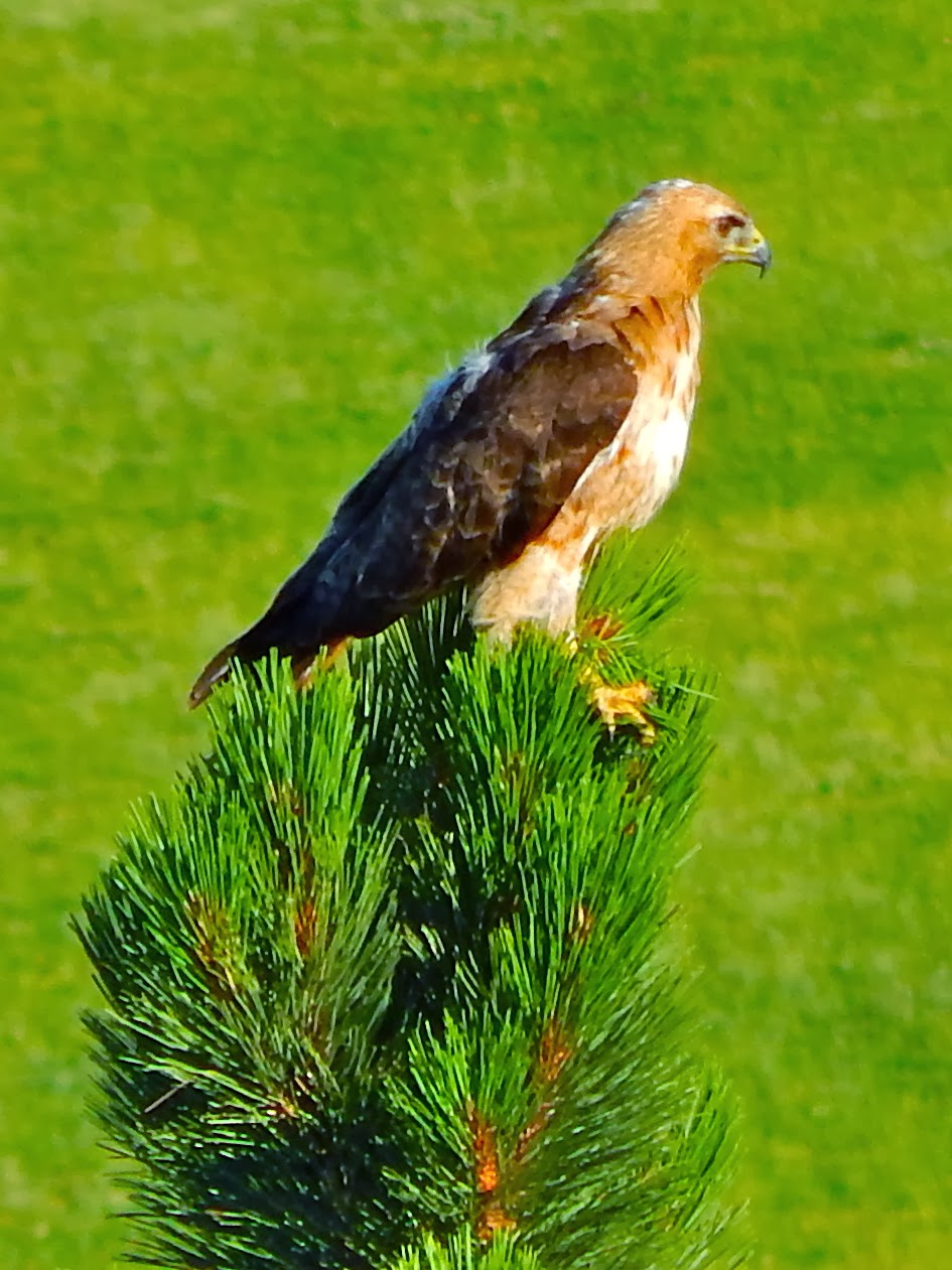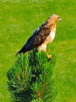 Working during the day, the broad-winged buteo soars above meadows surveying its territory for mice and possible intruders. It has a nocturnal neighbor that handles the nightshift. The red-tailed hawk frequently shares its land with the Great Horned Owl. Together, they form one of nature's most efficient, rodent exterminators.