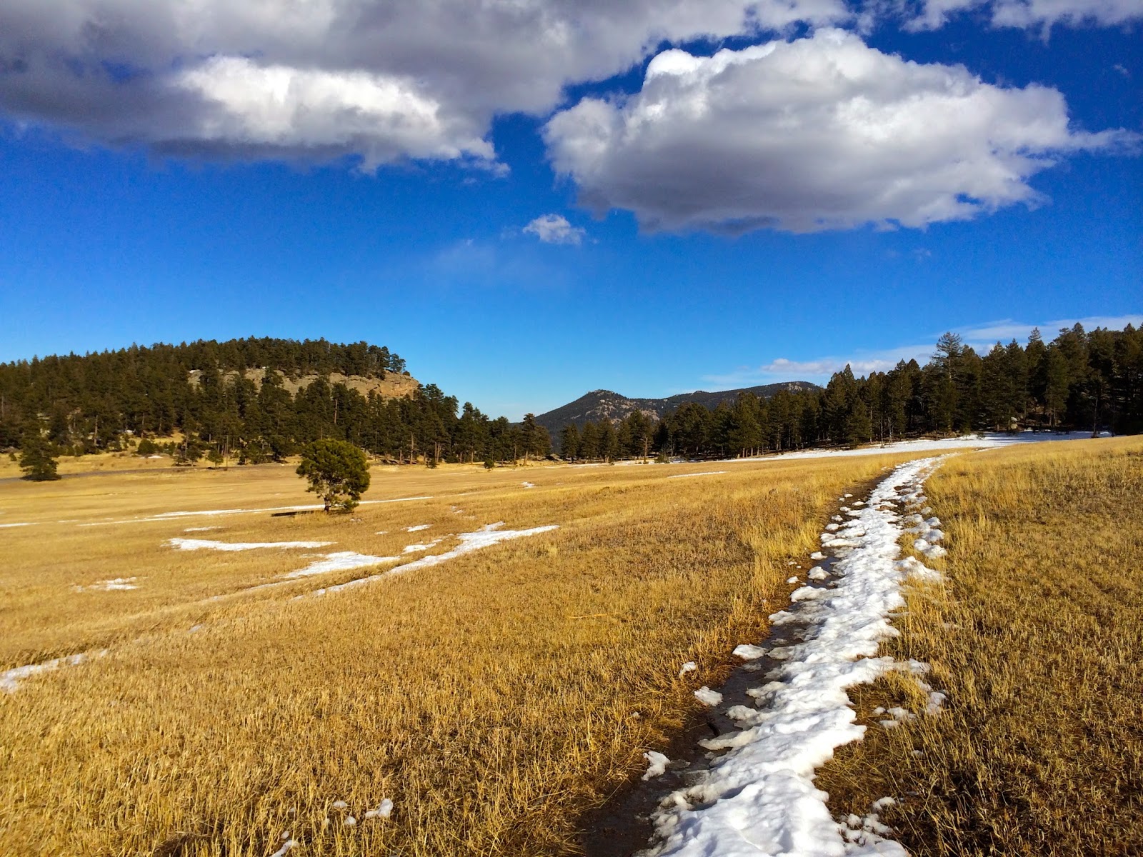 It's a warm, winter day at the Alderfer Open Space. The tranquil hike is a regular walk in the park. Eastward, long shadows are cast toward a trio of rocky crags while puffy white clouds drift across a clear blue sky. Known as the Three Sisters, the local landmark is gleaming in the golden light.