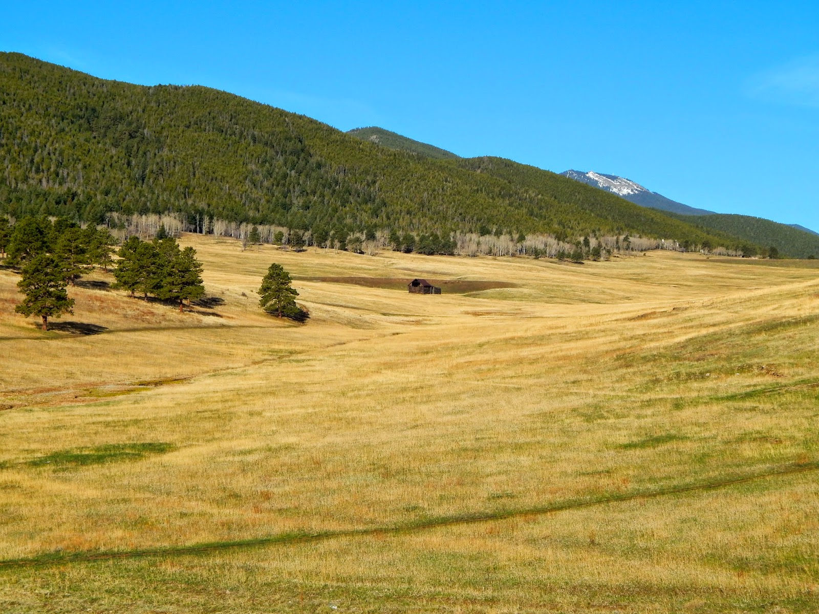 It's a cold morning during a solitary sojourn through Noble and Elk meadows. The aspen are mere skeletons against the drab pine. Long, violet shadows rippling across the yellow field are an interesting note during an ordinary sunrise.