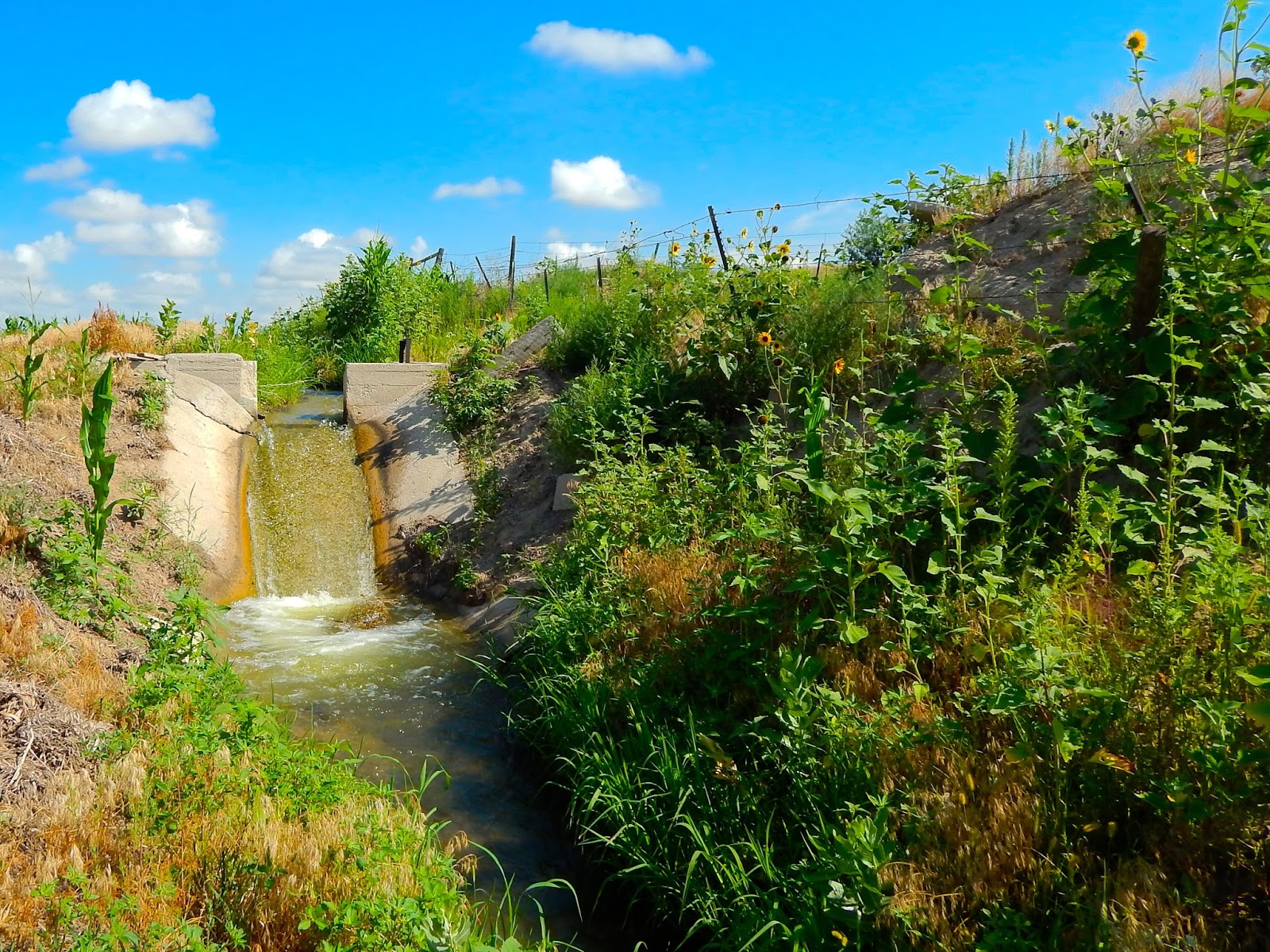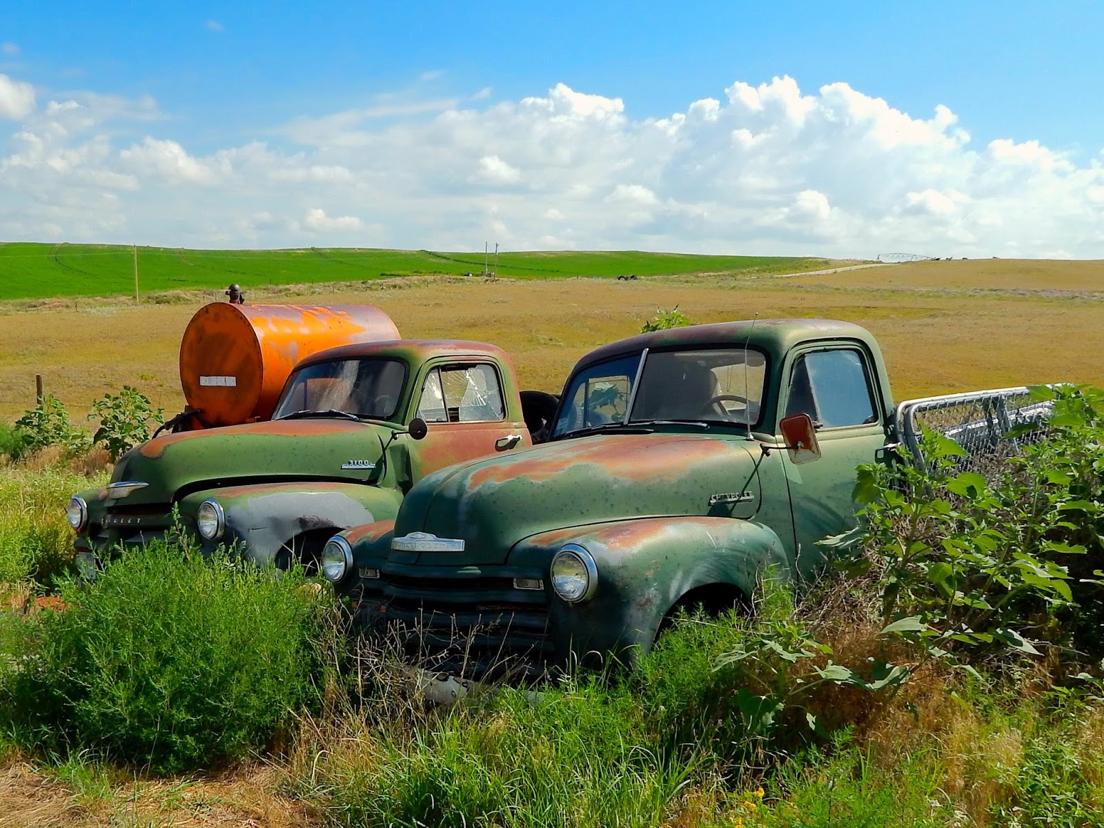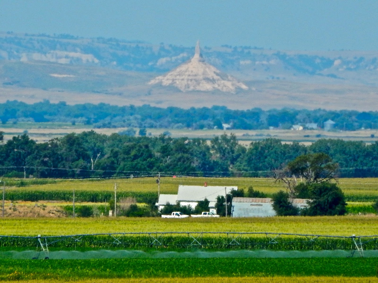 Atop the fell, an irrigation canal is running high where the views are sublime. It's a far-reaching panorama of farmland featuring Chimney Rock, clearly visible from fifteen miles away. Despite their decay, a pair of Chevy trucks seem surprisingly picturesque.