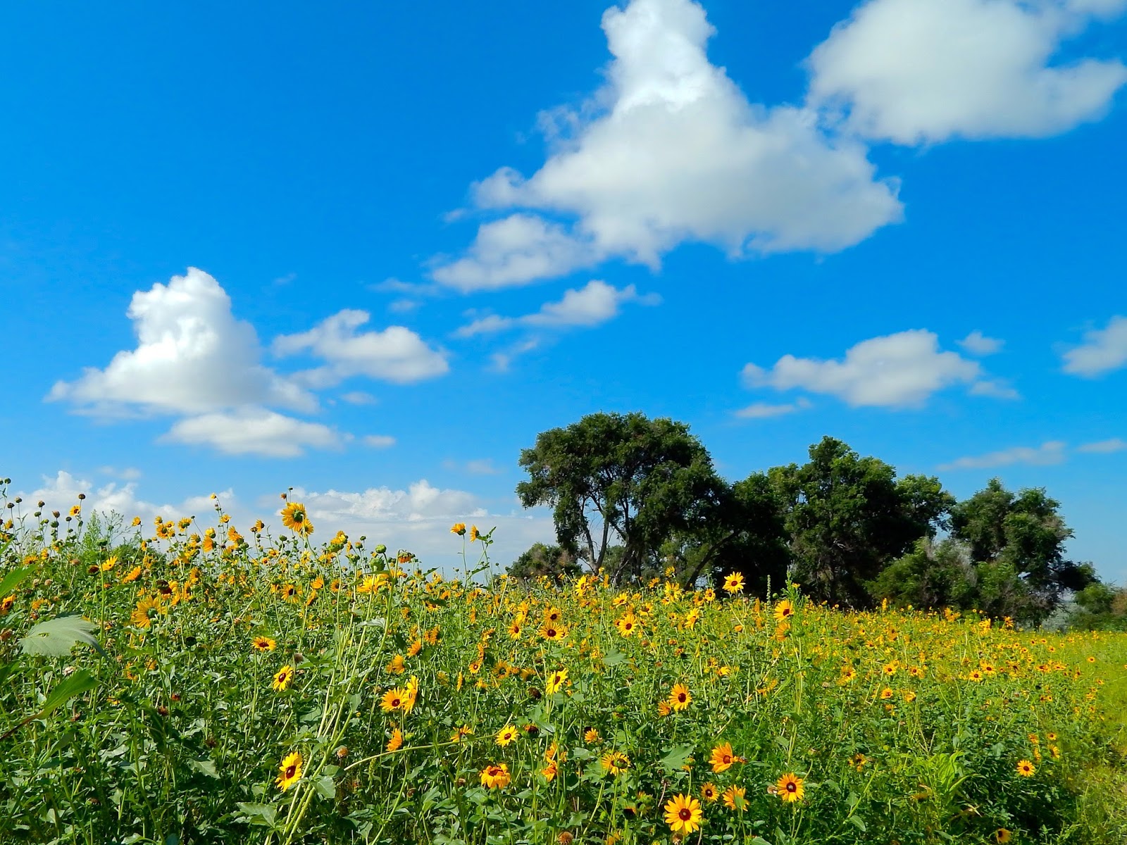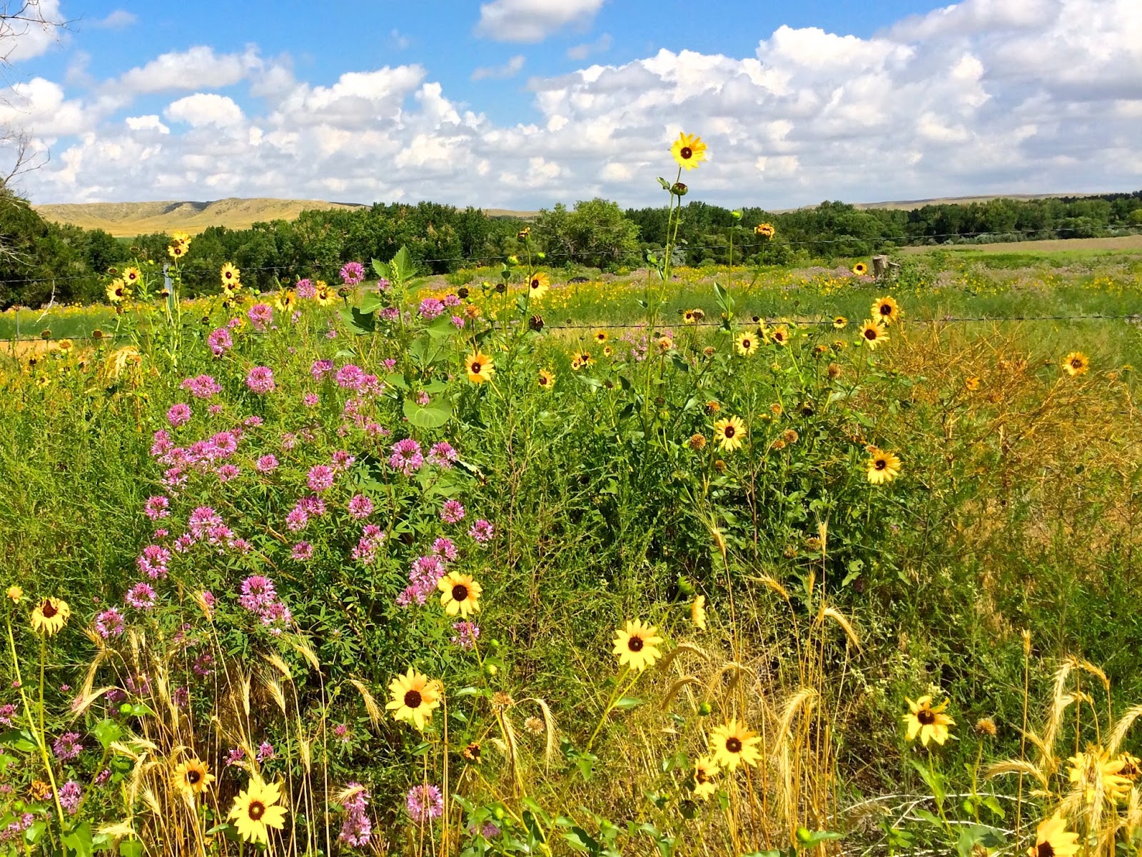 Follow the dogs around the crop and you'll discover a field full of life. Avoid the stickers and watch for woodpeckers in the old tree stand. The hills are alive with a kaleidoscope of color. A profusion of colorful wildflowers decorate the normally brown pastures.