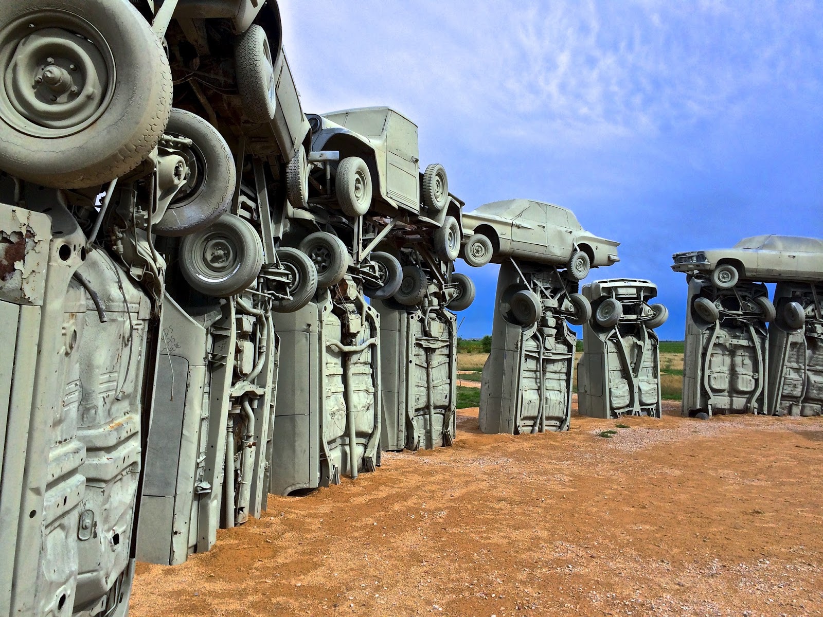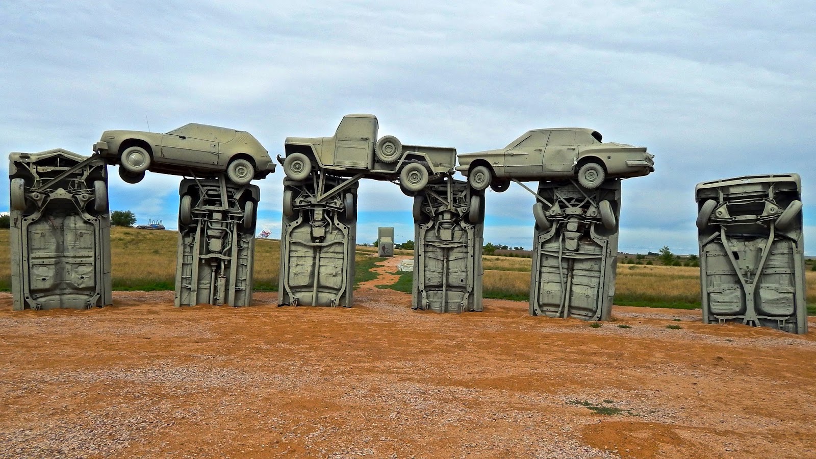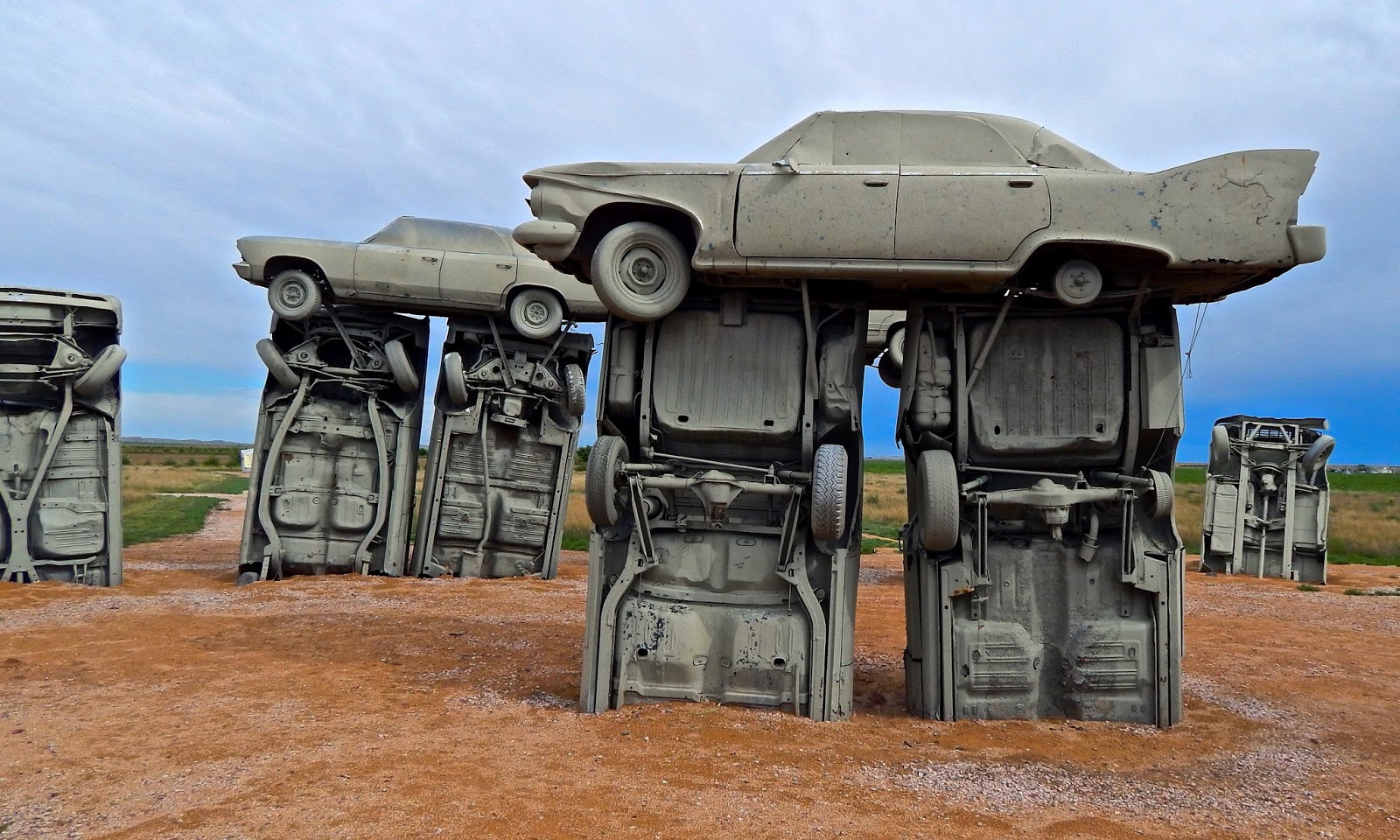 The grouping of gray gas guzzlers is a remarkable recreation. Aligned with the summer solstice, Carhenge faithfully replicates Stonehenge's current tumble-down state. As well as the main circle, the exhibit includes two station stones, three upright trilithons, the Slaughter Stone and the mysterious Heel Stone.