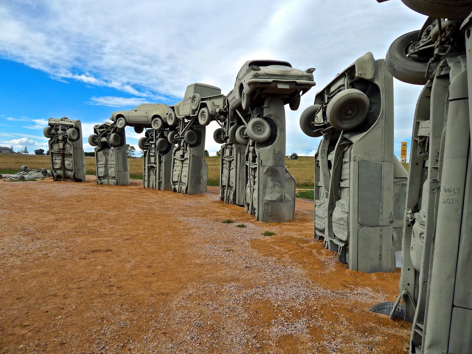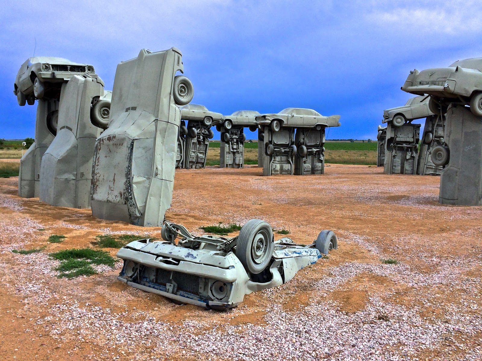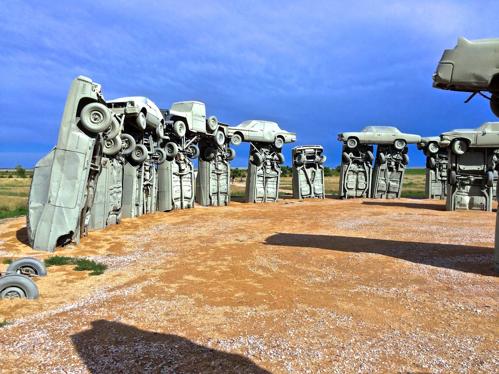 The grouping of gray gas guzzlers is a remarkable recreation. Aligned with the summer solstice, Carhenge faithfully replicates Stonehenge's current tumble-down state. As well as the main circle, the exhibit includes two station stones, three upright trilithons, the Slaughter Stone and the mysterious Heel Stone.