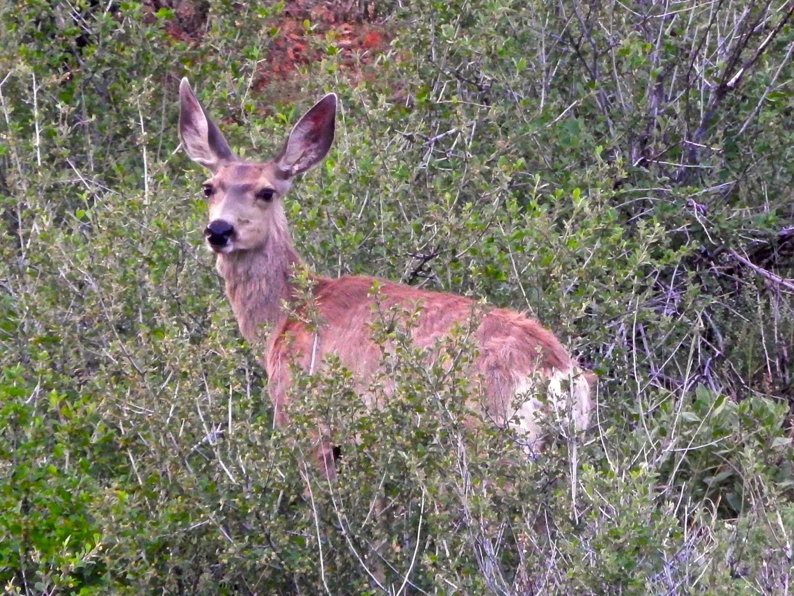 The lush environment is a birder's paradise that, after crossing an old wooden bridge, gives way to steep hillsides. Teeming with wildlife as well, the scrub forest is most definitely the domain of the mule deer.