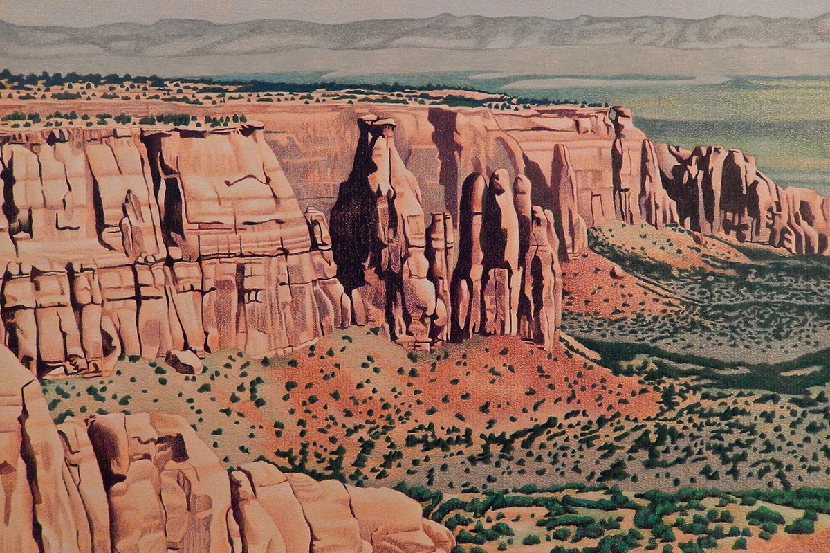 The piece is meant to be an accurate representation of the view from an outstanding overlook along Rim Rock Drive. So if it seems like a study in Surrealism, nothing could be further from fact. This detailed drawing is a classic case of the truth being stranger than fiction.