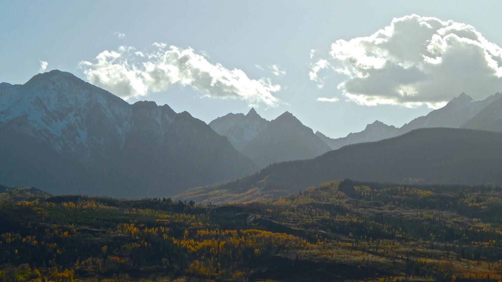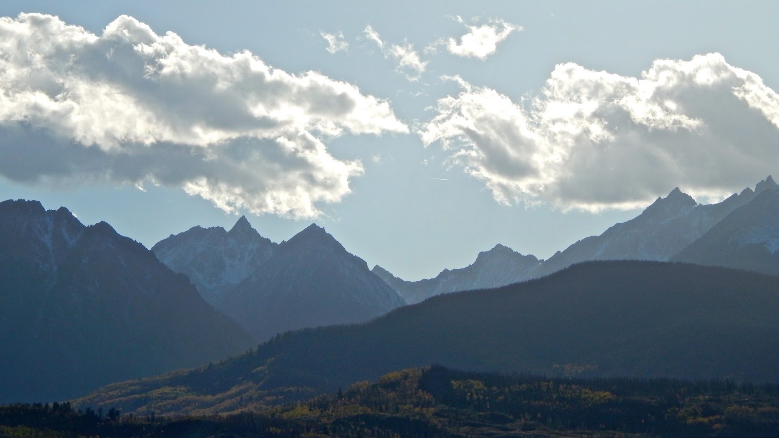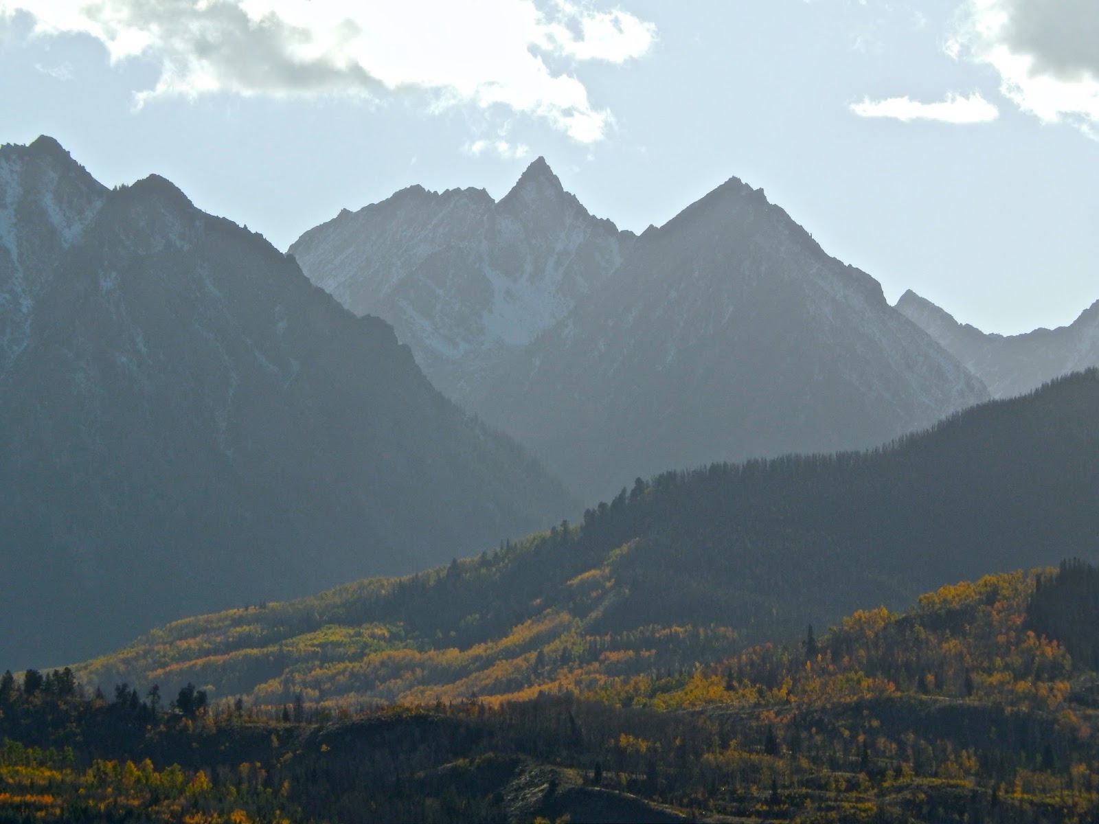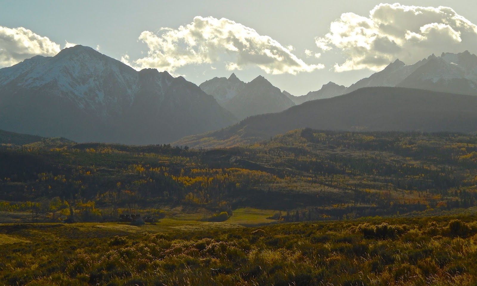 North out of Silverthorne on a late fall evening, I made a desperate rush up Ute Pass Road to beat the fading light. Backlit by the setting sun, the blue mountains were outlined with a heavenly glow.
