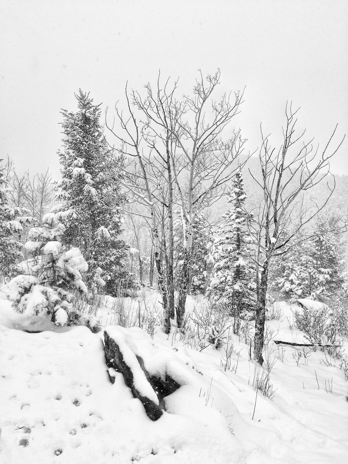 Spring began with a kaleidoscope of bright colors but scarcely into the new season and a surprise snowstorm converted the saturated scenery to grayscale. Moist flakes were dumped for days and eventually exceeded three feet.