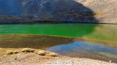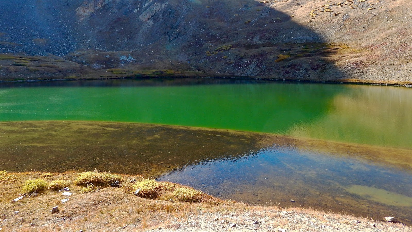 After scrambling up to the far ledge, you behold another quite shocking color scheme as the long, upper lake is surprisingly green. Squinting into the sun, you can see Square Top Mountain’s eastern slope slide right into the silky tarn.
