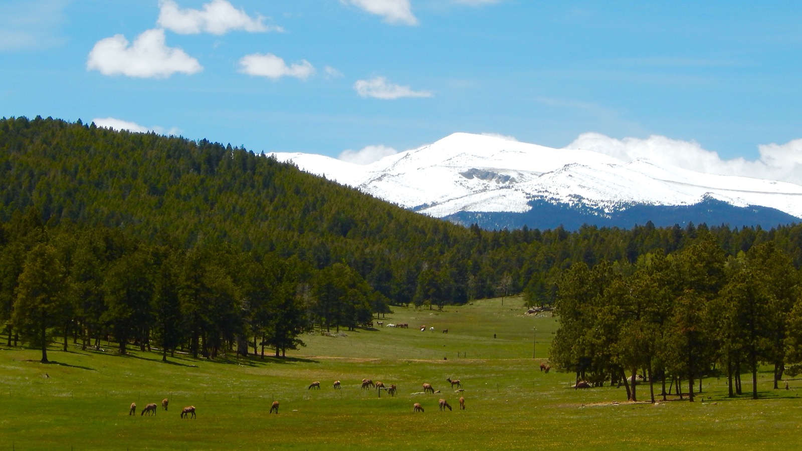 Forged out of an expansive pine forest, the open grassland is an important oasis for horses, deer and elk. All three species are often seen peacefully grazing together below the gleaming white peaks looming in the background.