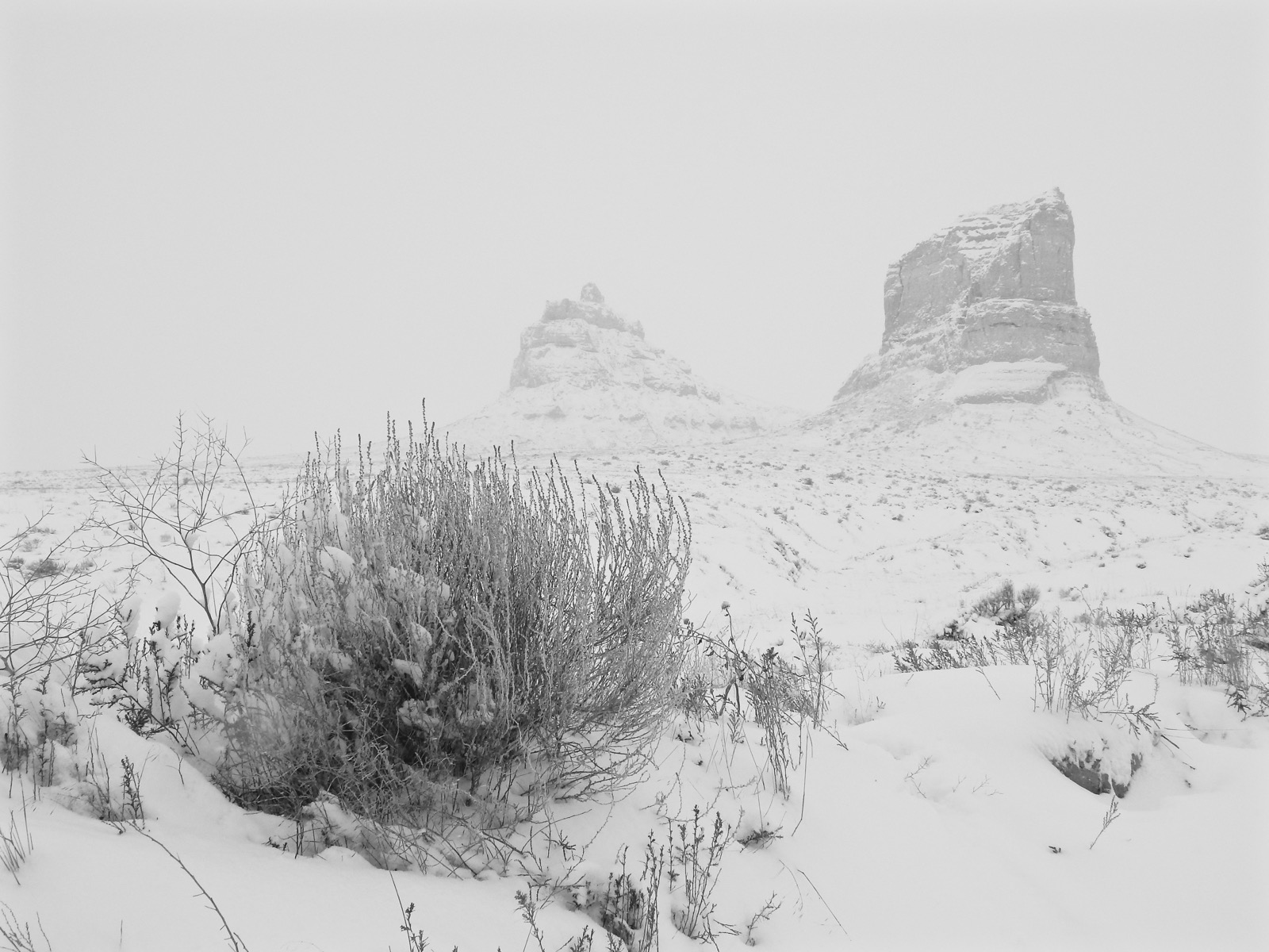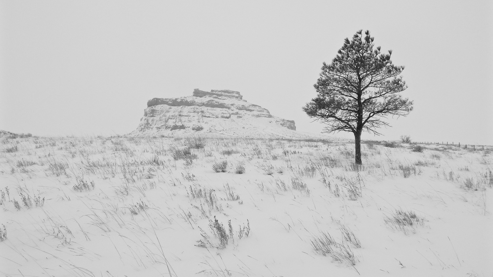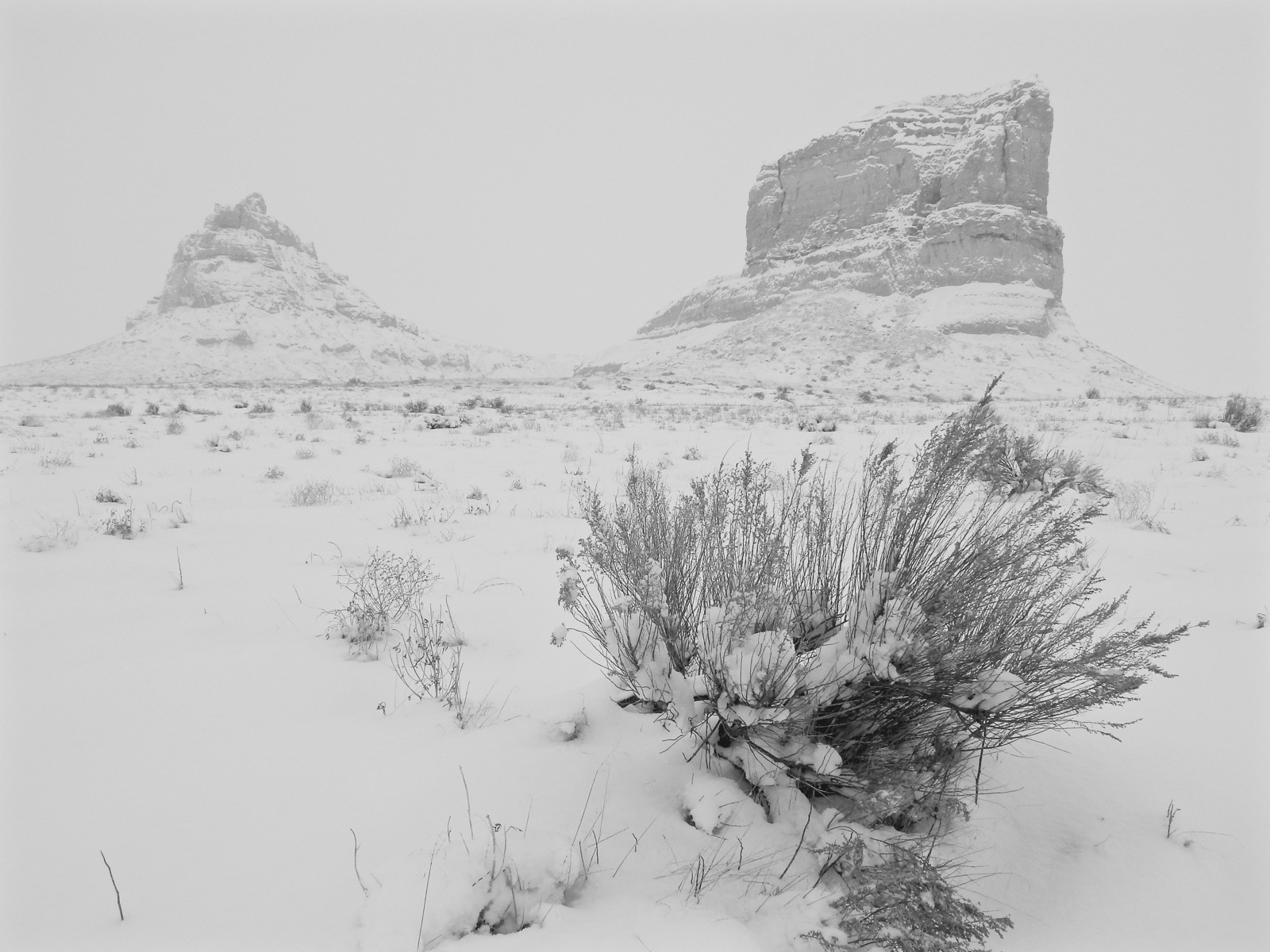 On a wintry morning in western Nebraska, I wandered around Courthouse and Jail Rocks, photographing the countryside in bad weather. The megaliths were like ghosts of the Great Plains as they were barely visible during an extreme whiteout.