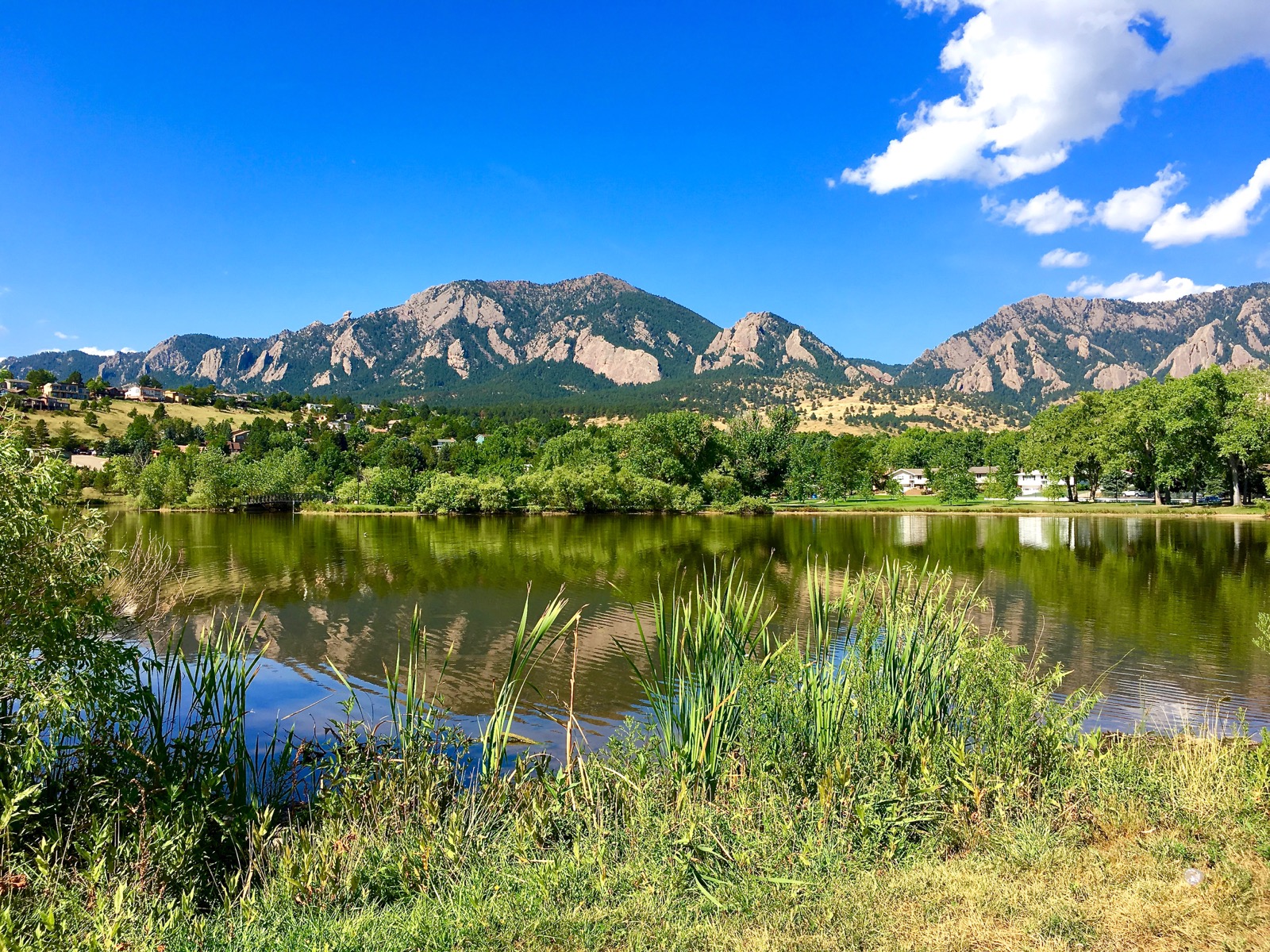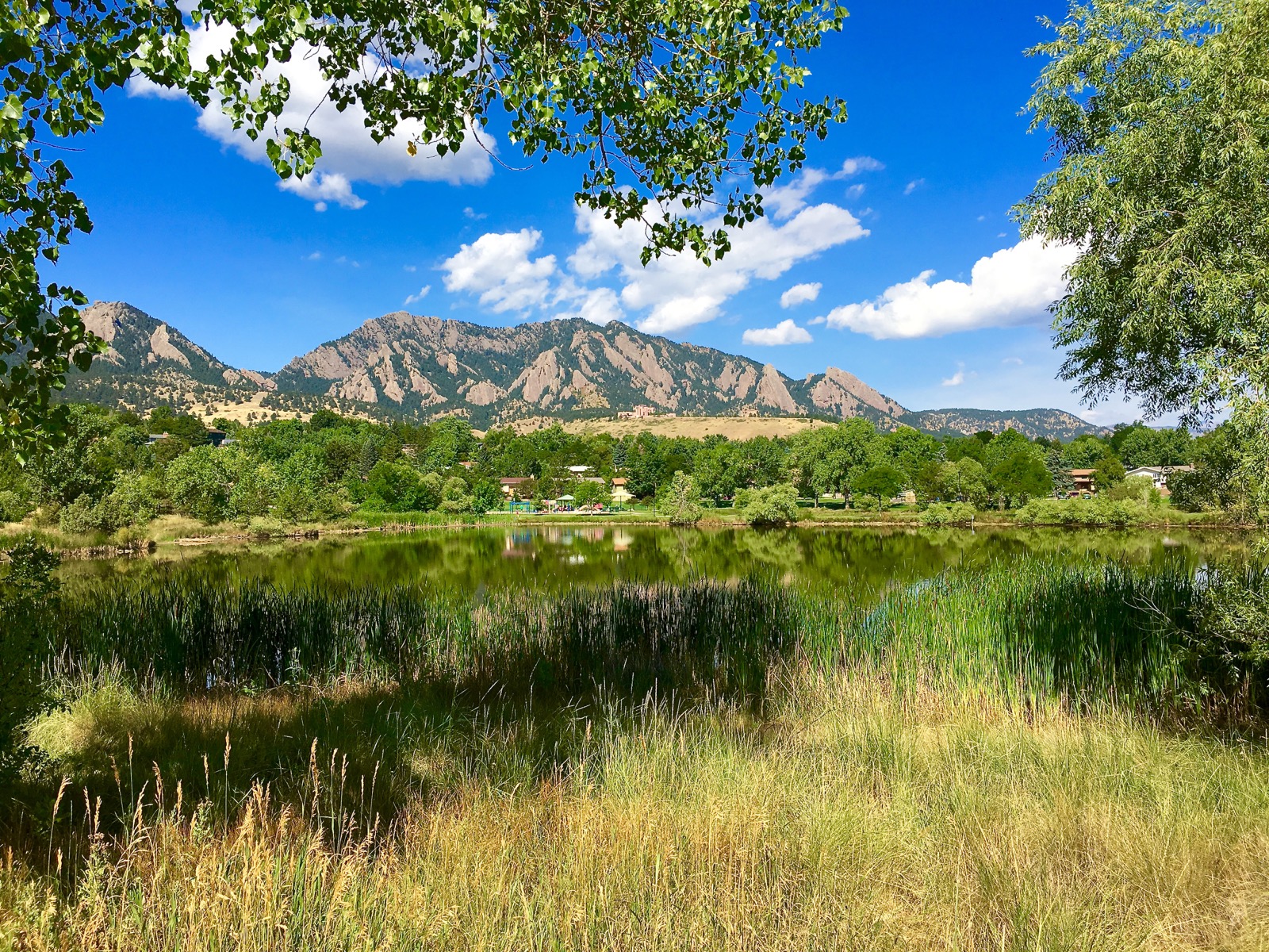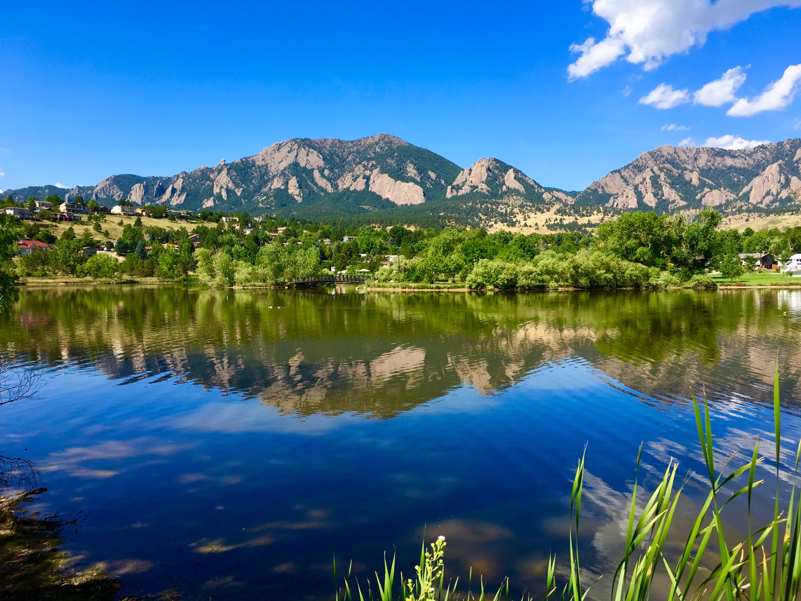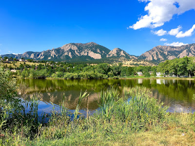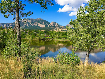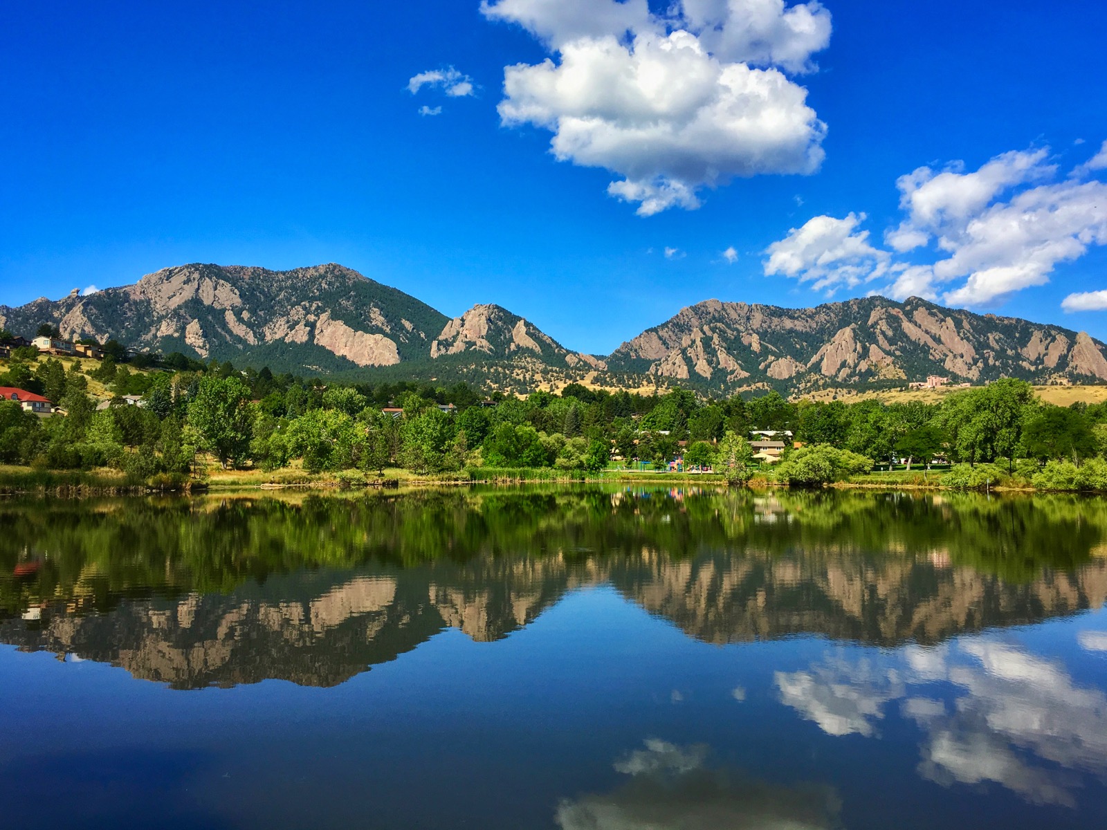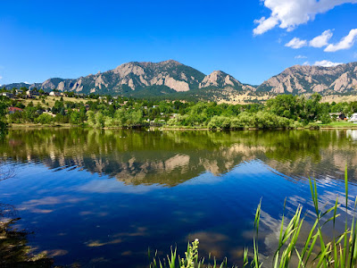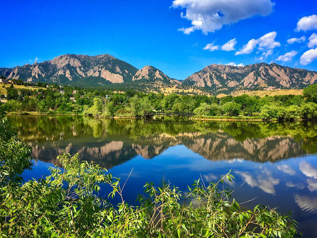 The Flatirons rock formations create an impressive backdrop that’s mirrored symmetrically across the placid pond. On this September morn, structural white clouds float across a deep-blue sky.