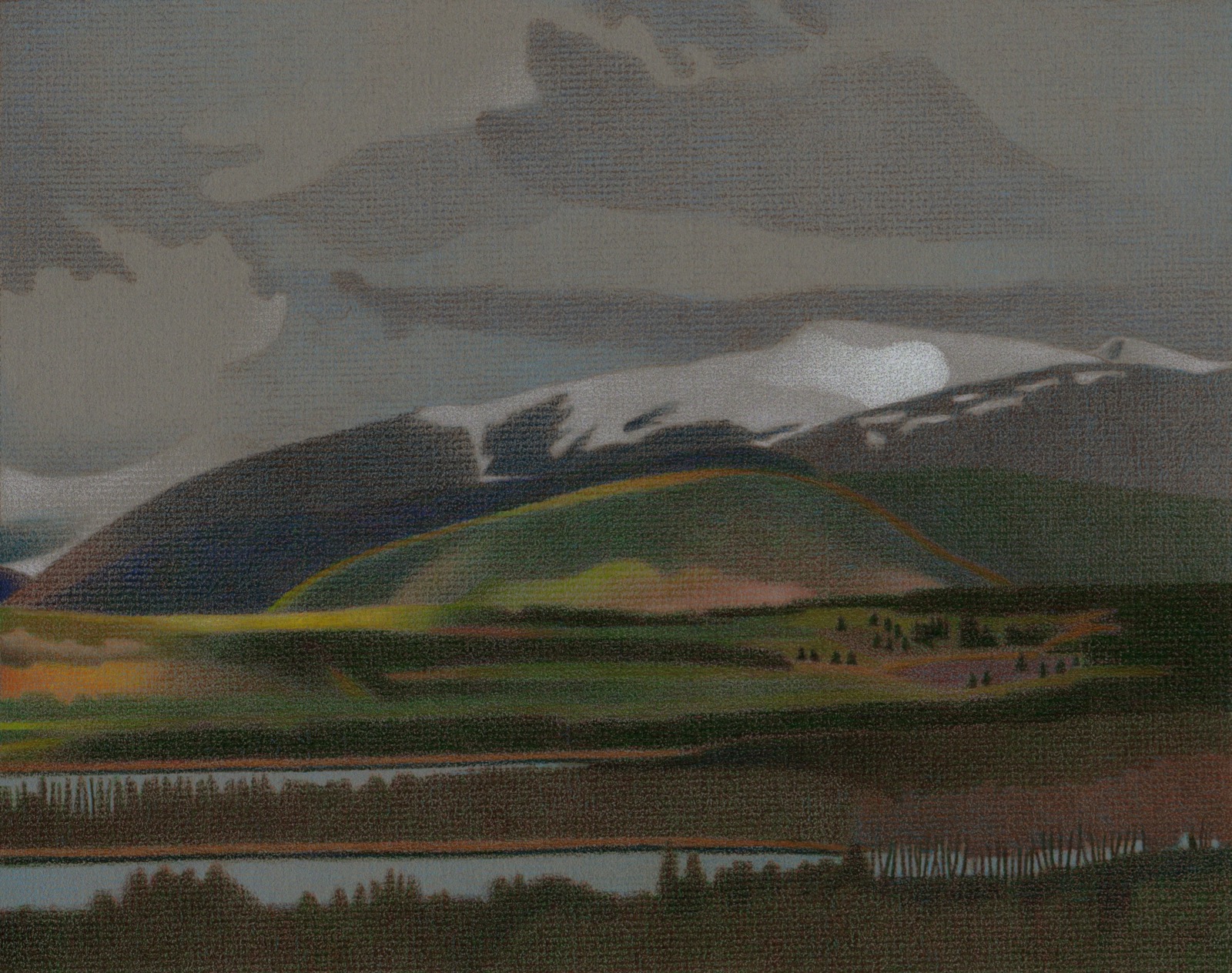 Where the sun’s rays are allowed to touch the earth, patches of vermillion warm the low-key landscape. Those shafts of surreal light stream through the imperial heavens and conclude the composition by highlighting the innocent, white peak.