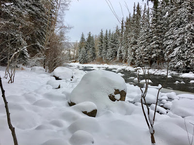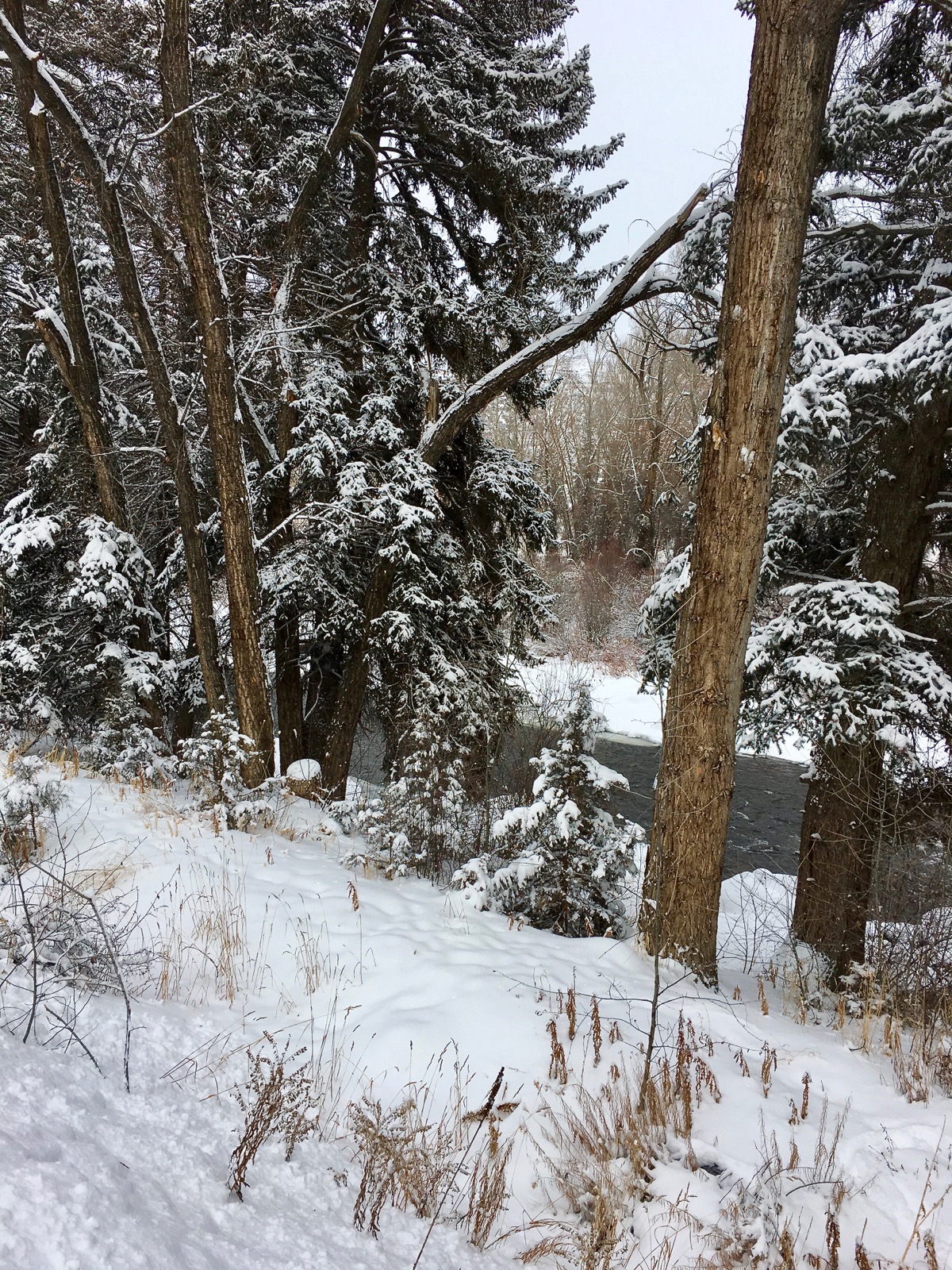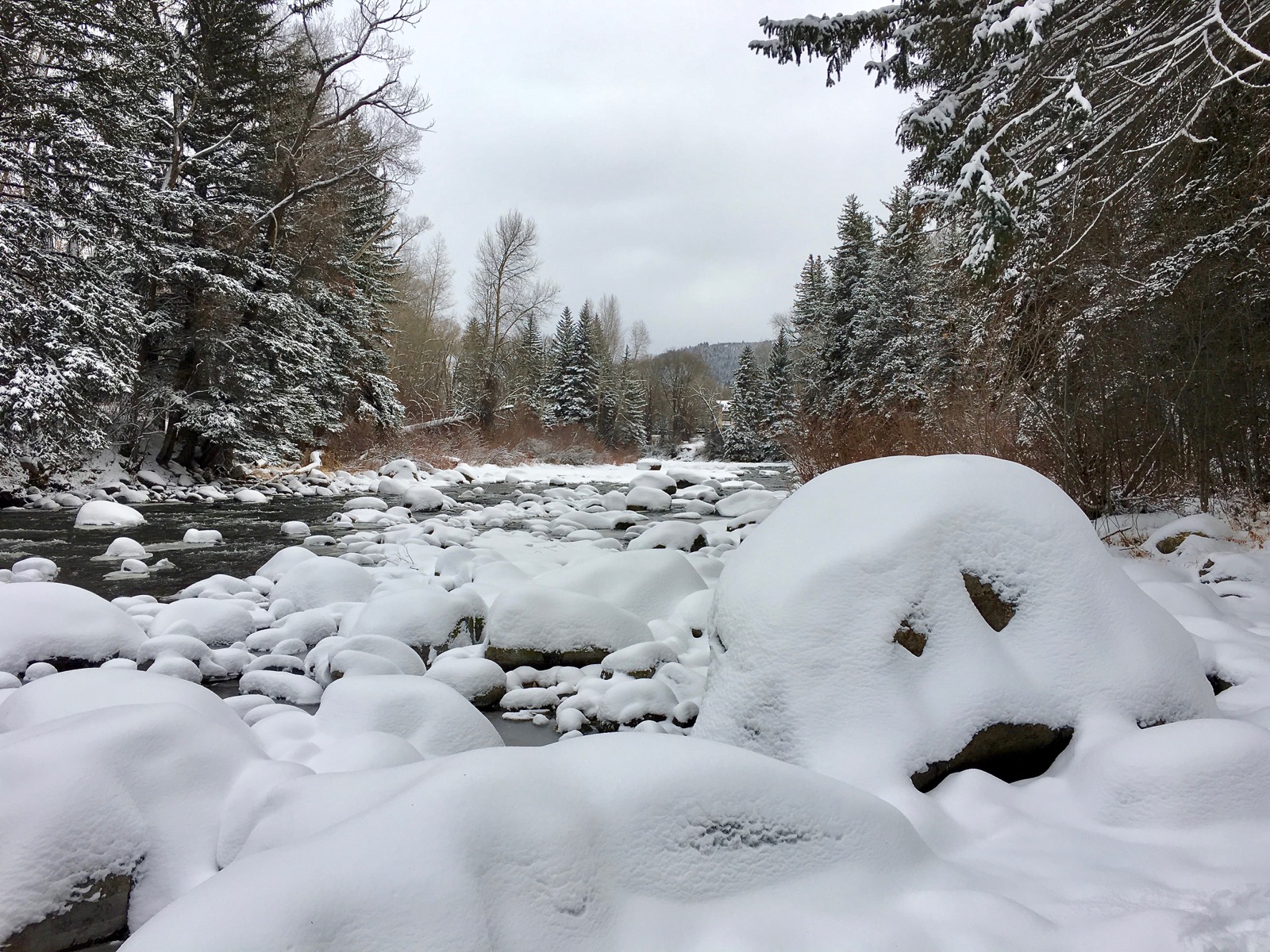Treading lightly along the frozen riverbank, the thin ice cracked ominously with every footfall. During the dead of winter, the river runs at its shallowest so the rough edges of exposed boulders were softened by caps of fresh snow.
