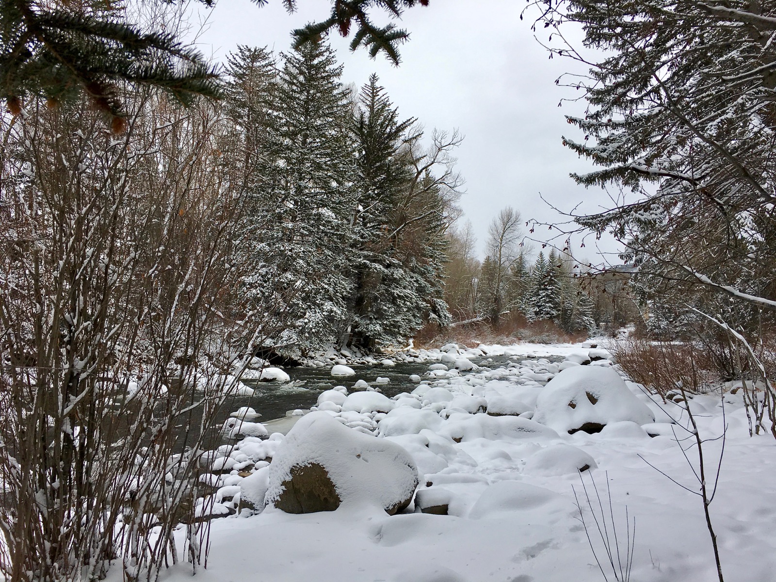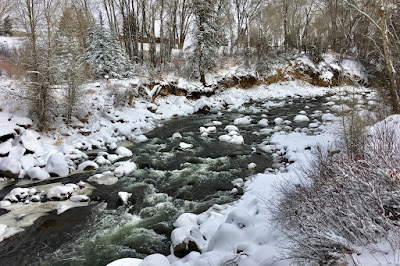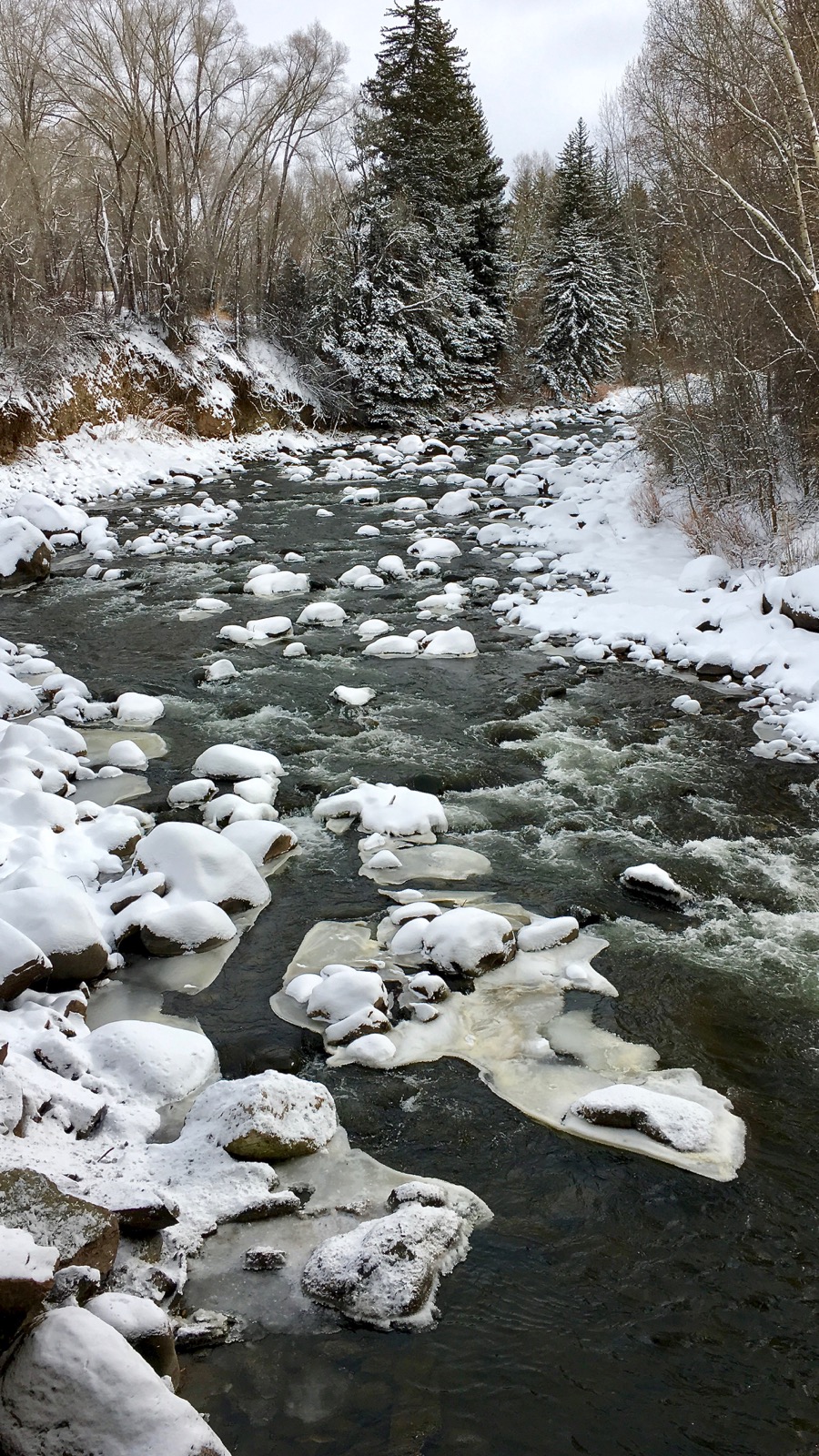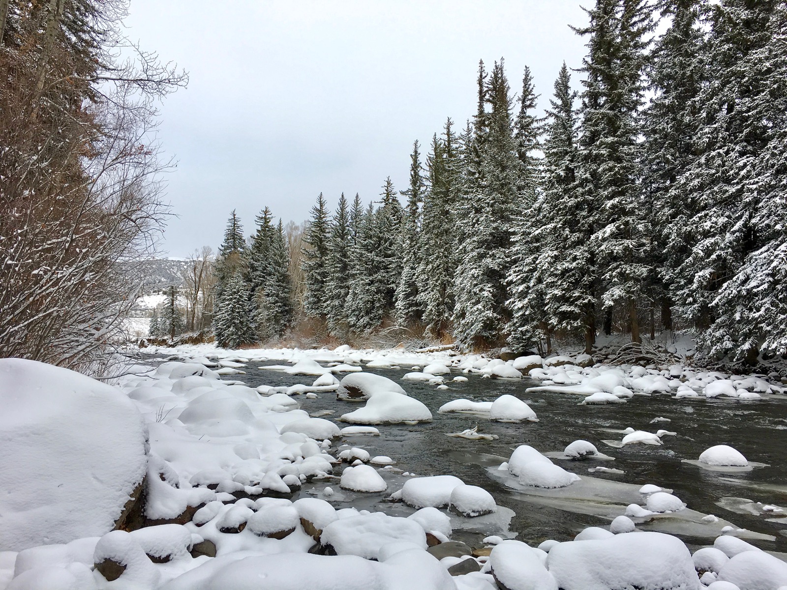 I encountered the Eagle River at Edwards, Colorado the morning after a terrific snowstorm. Still dark and blurry under the cover of dense clouds, the vigorous creek wound its way into a black forest of frosted pine trees.