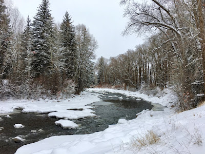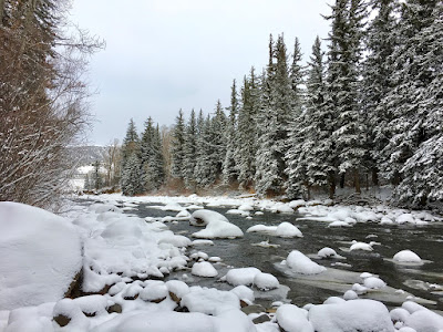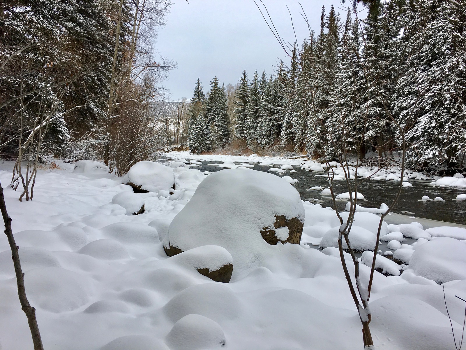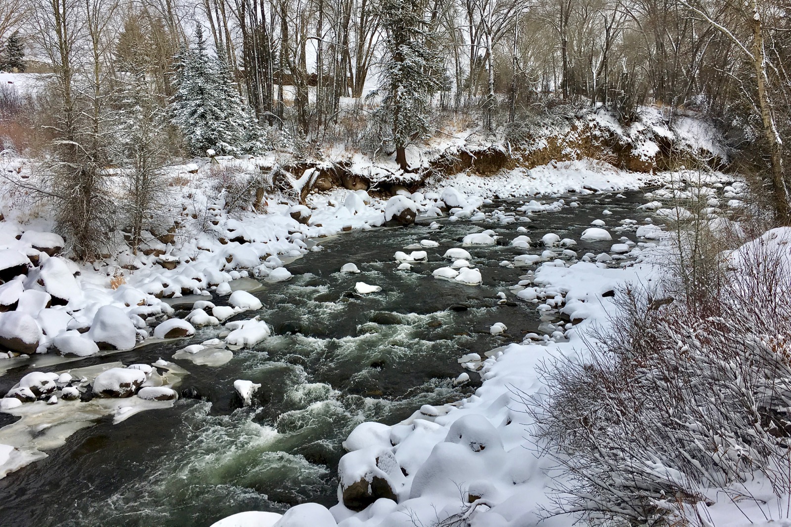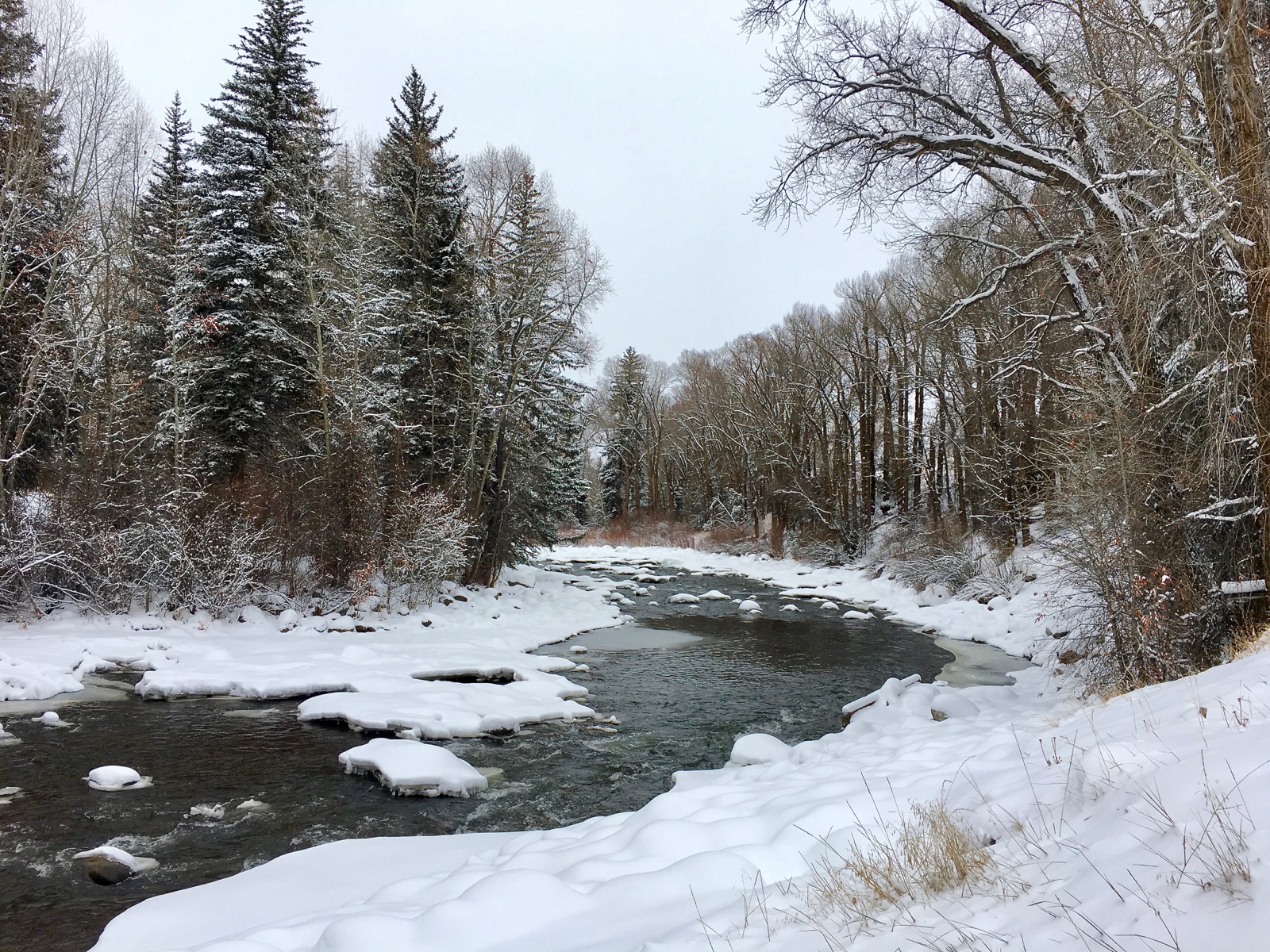I encountered the Eagle River at Edwards, Colorado the morning after a terrific snowstorm. Still dark and blurry under the cover of dense clouds, the vigorous creek wound its way into a black forest of frosted pine trees.