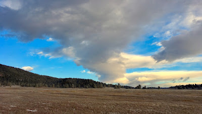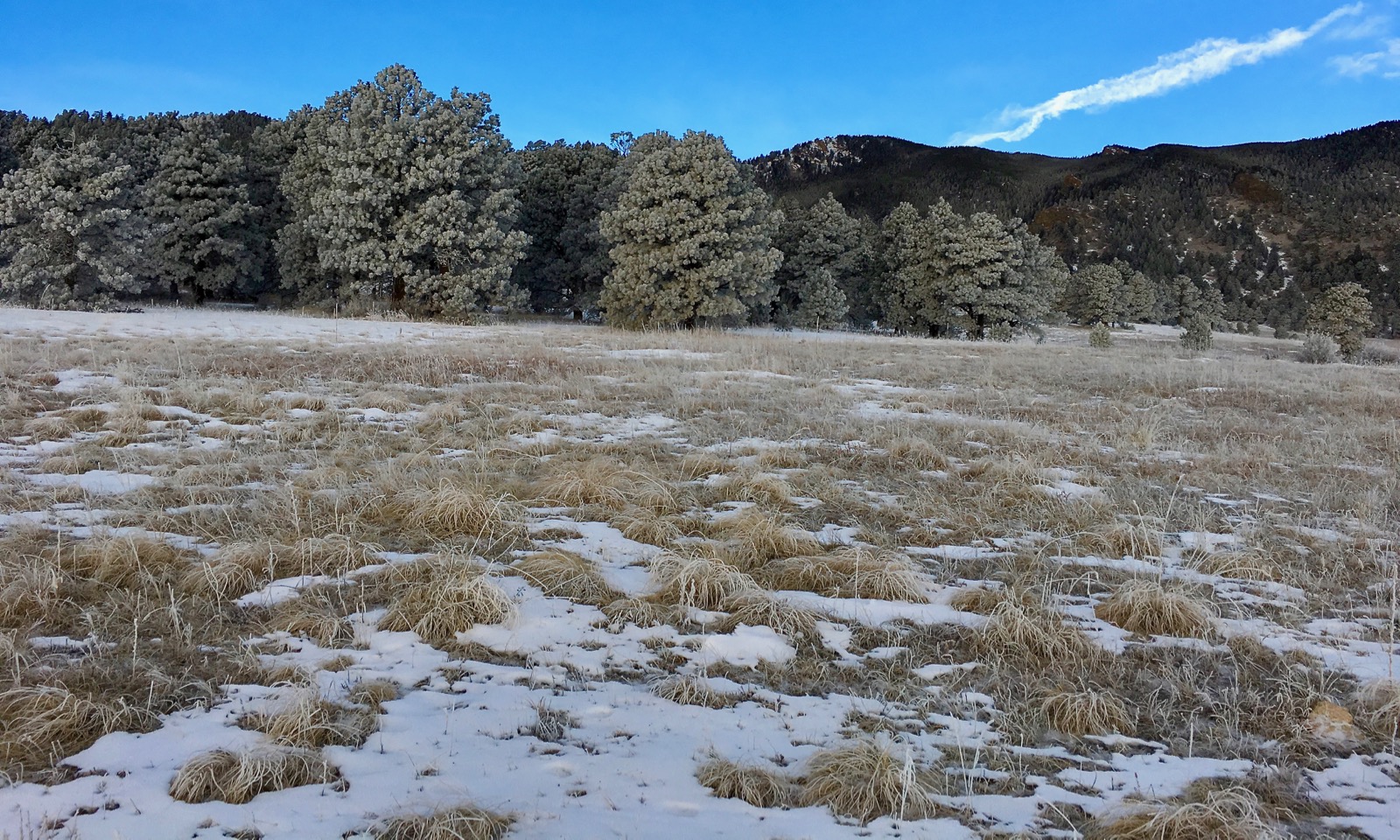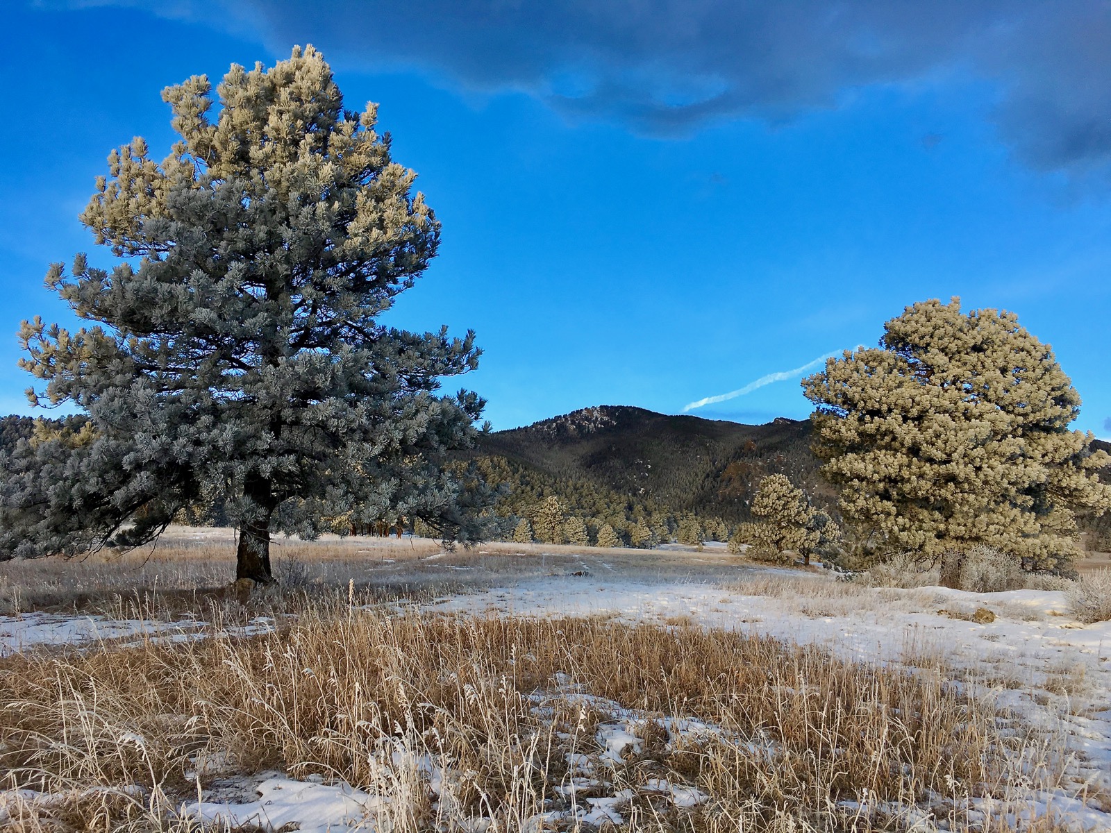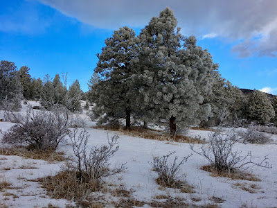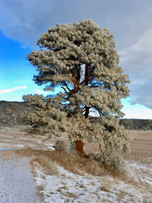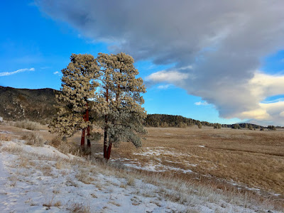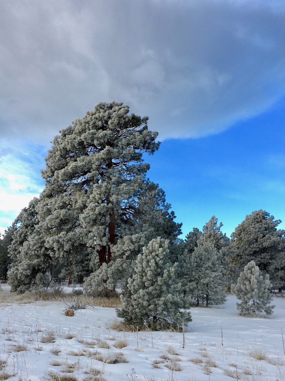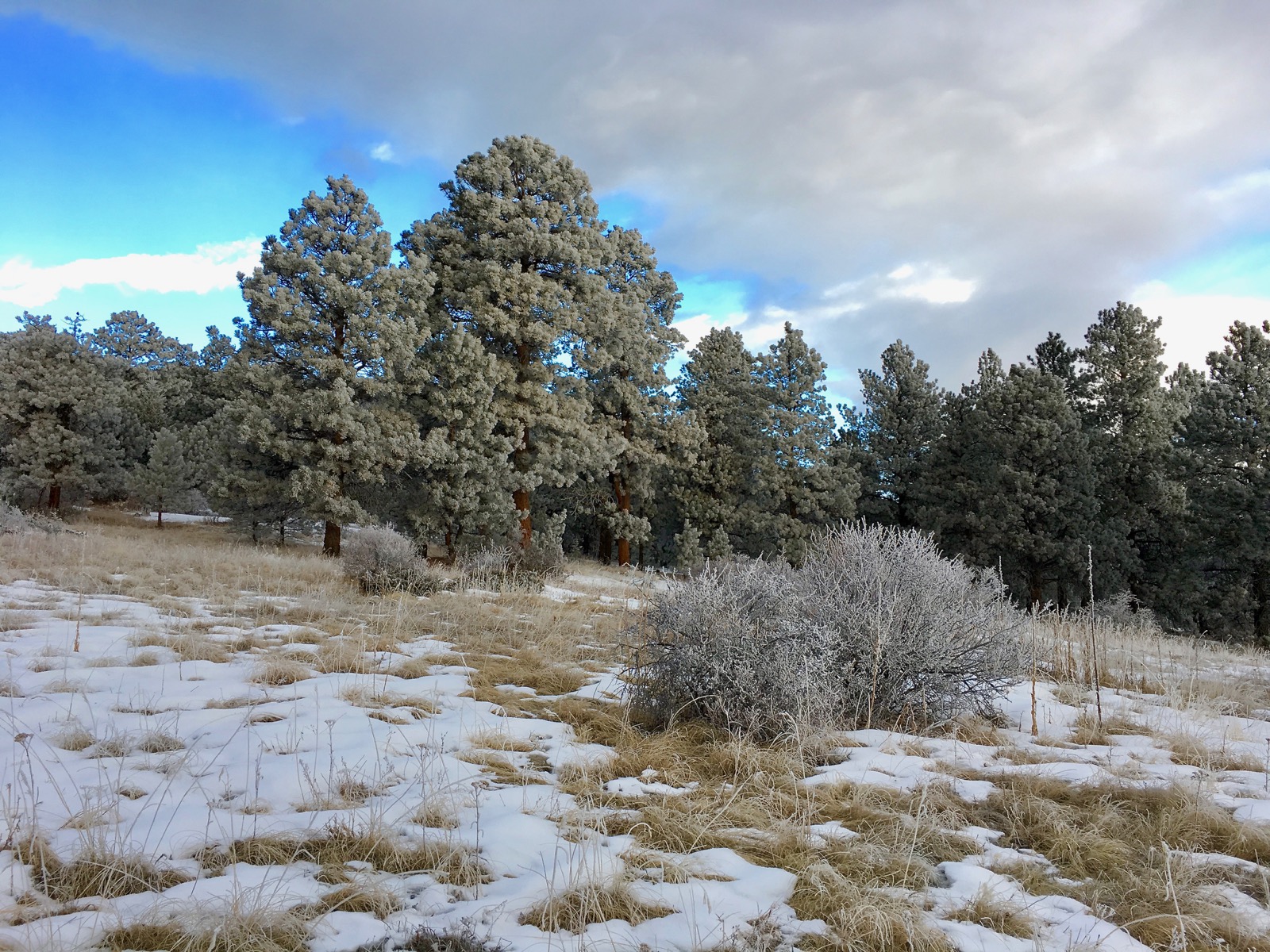 Plastered with a coating of fresh snow, the pine trees are glittering white against the windswept grassland. After the frigid sunrise, lemon-colored clouds swirl ominously across the northern sky.
