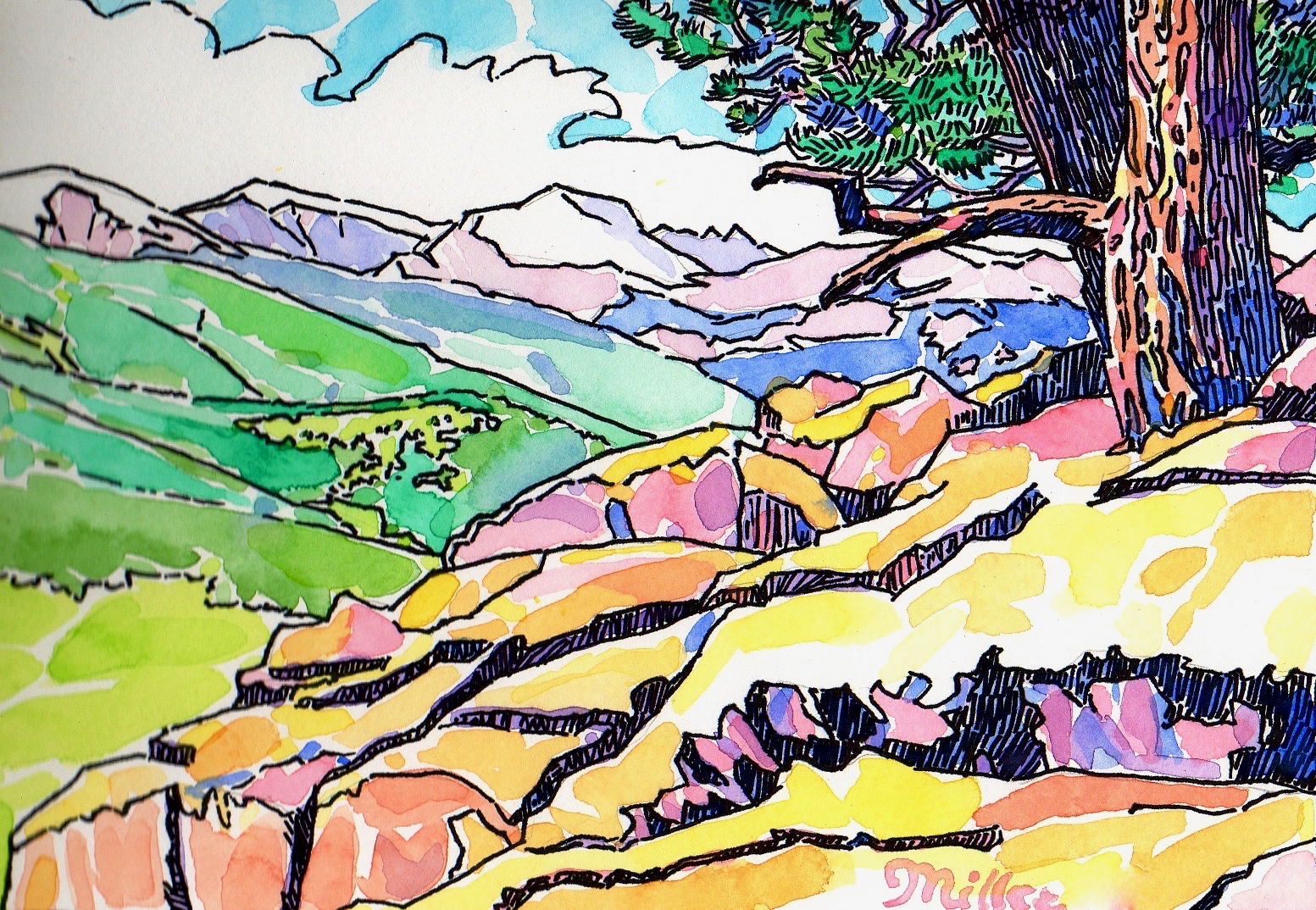 It’s an early-summer morning at the summit of Evergreen Mountain and the thin air is clear and crisp. The strokes of pure color brushed loosely onto the page are confined by the black ink that traces the mountain landscape.