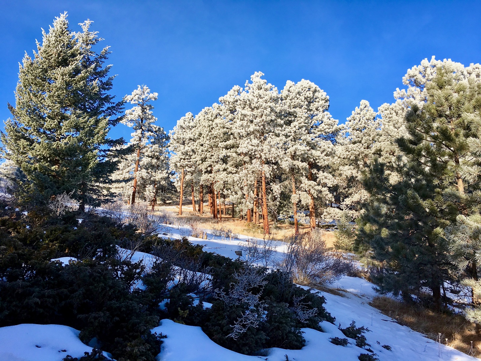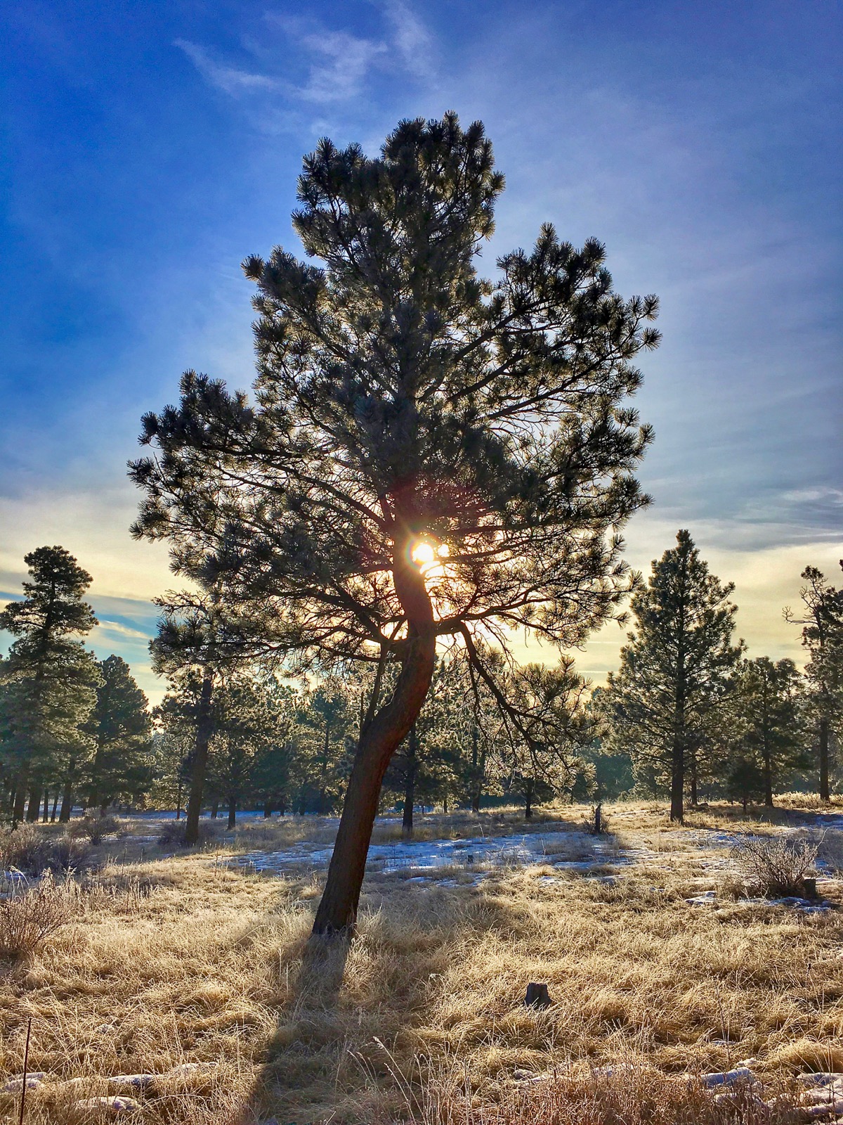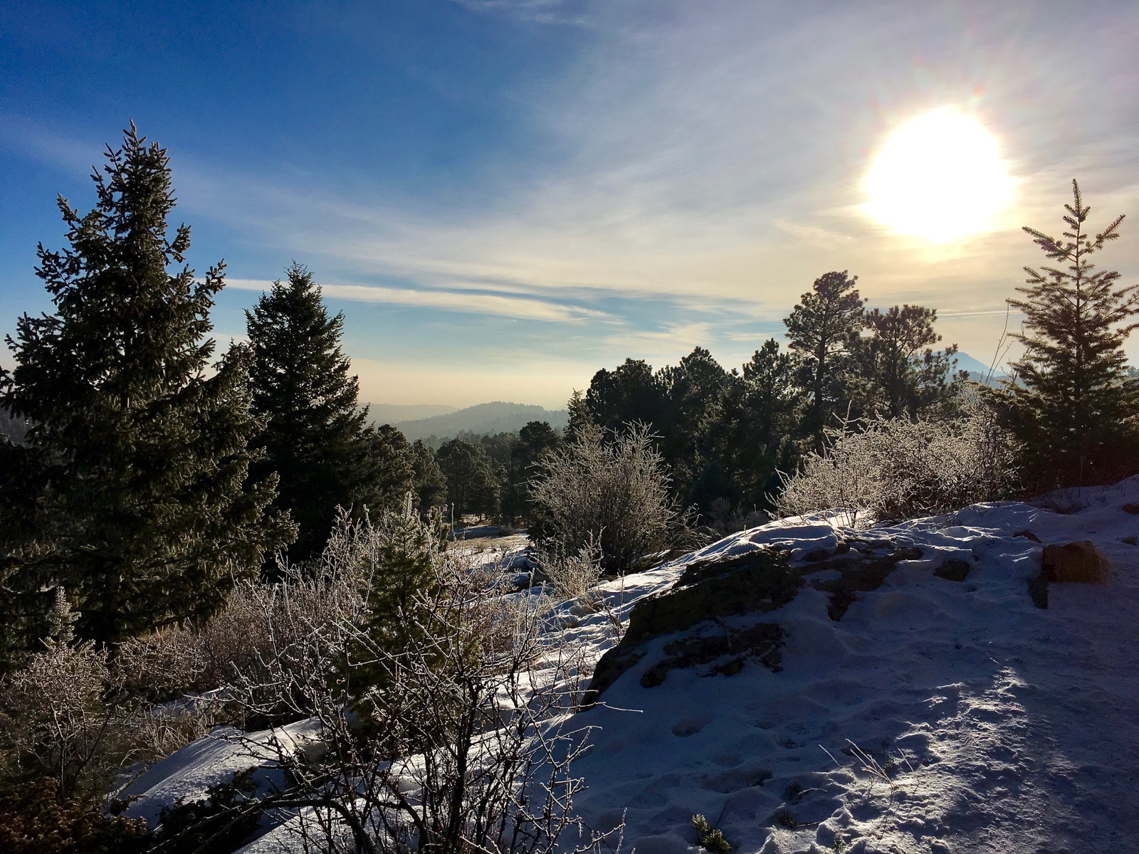 The morning after a dusting of fresh snow, the cold air is filled with an eerie silence. Diffused sunbeams stream through the clearing sky, permeating the forest with an ethereal light.