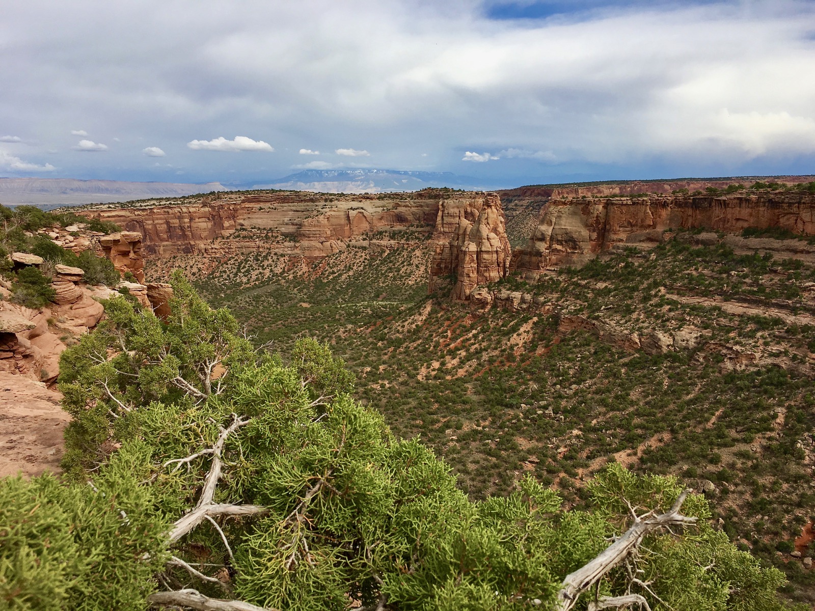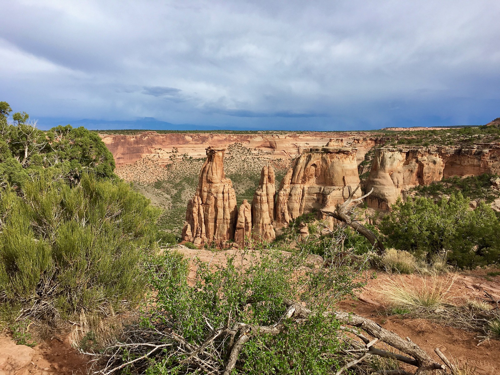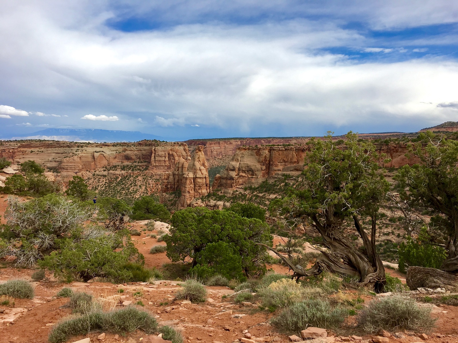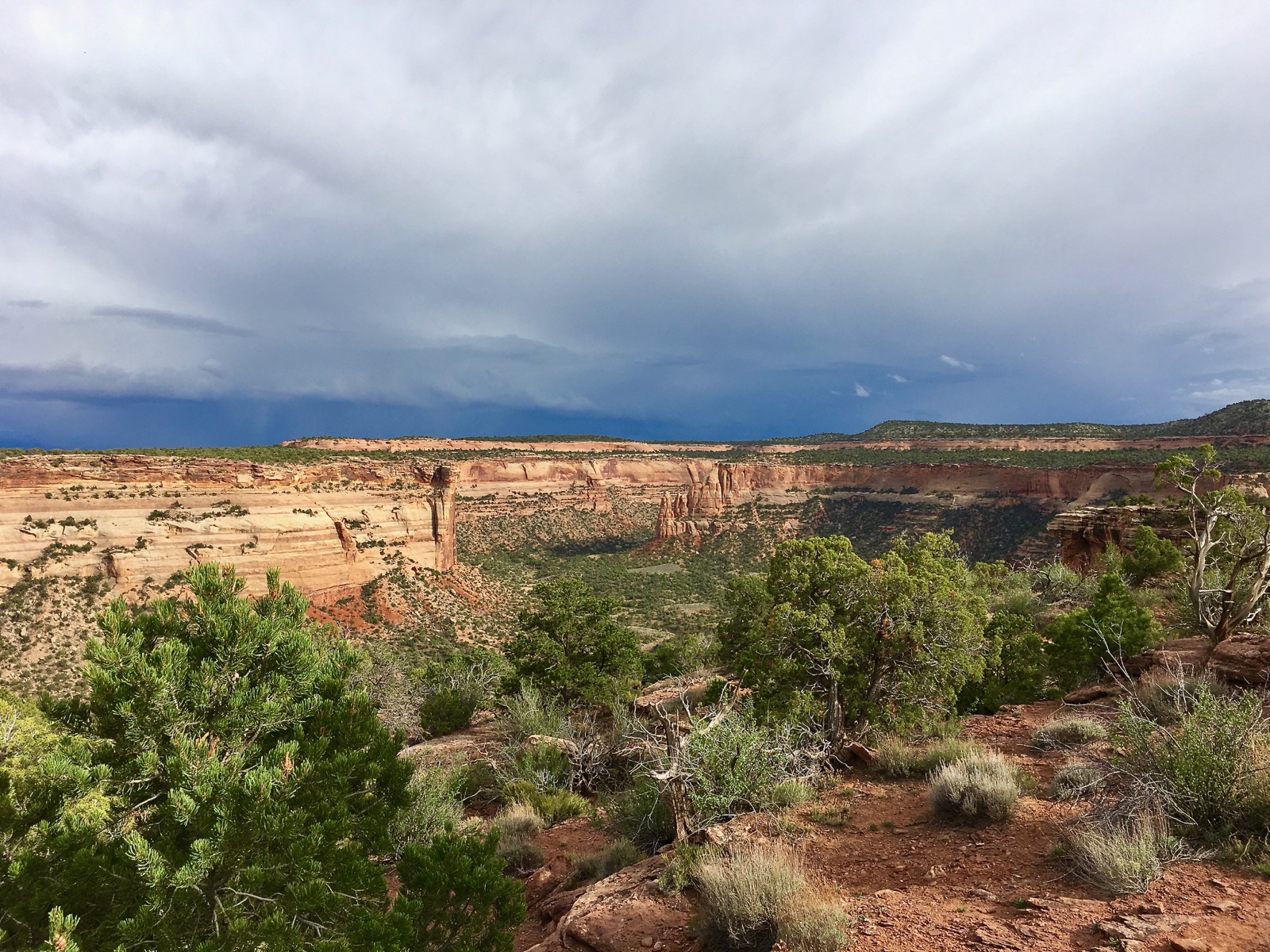 During an evening hike on the heels of a passing Spring storm, beams of soft light come streaming through the steel-gray clouds. While following a broken trail that skirts the chasm’s rim, Monument Canyon is the main attraction but the distant Book Cliffs and Grand Mesa are impressive as well.