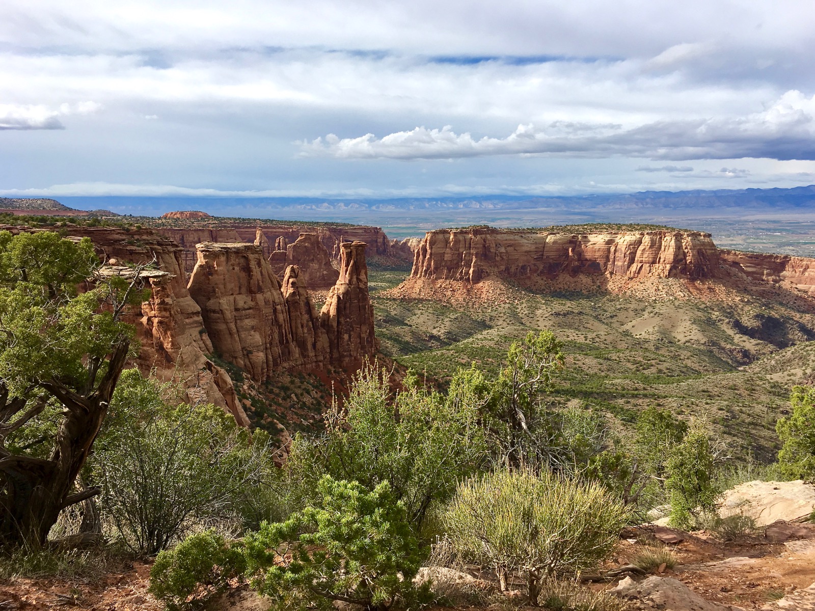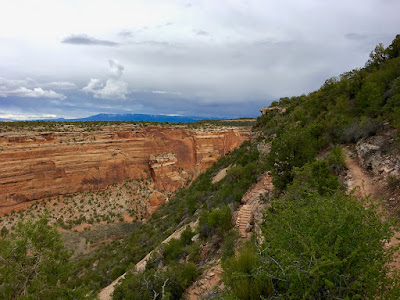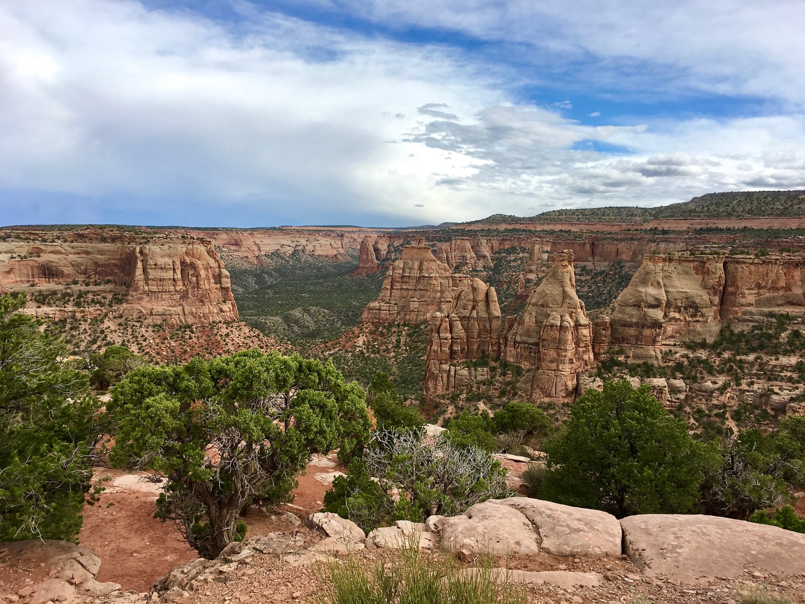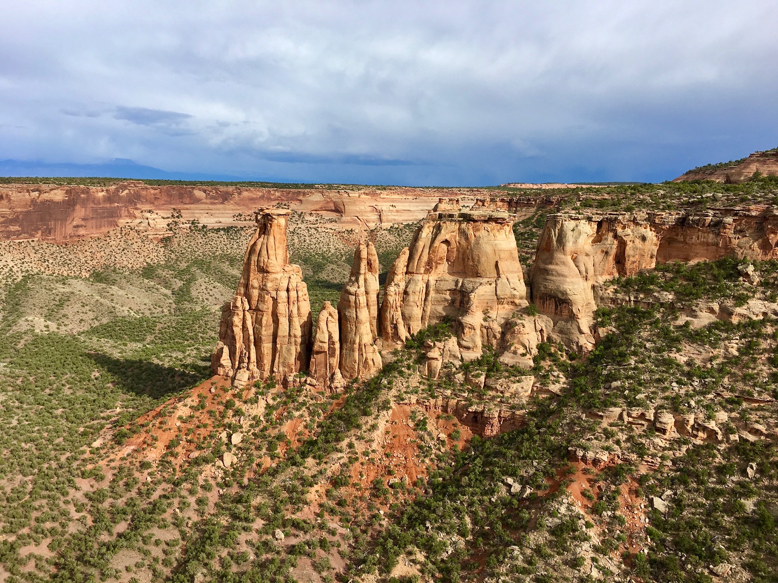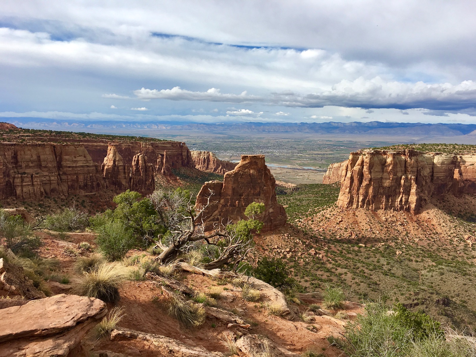 During an evening hike on the heels of a passing Spring storm, beams of soft light come streaming through the steel-gray clouds. While following a broken trail that skirts the chasm’s rim, Monument Canyon is the main attraction but the distant Book Cliffs and Grand Mesa are impressive as well.