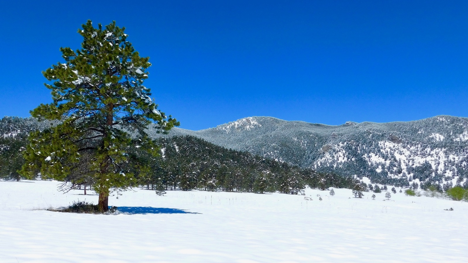 Frosted Bergen Peak looms over the white meadow where a grove of green aspen accentuates the scenic splendor. Blue shadows undulate across a frozen surface that blankets the rugged earth buried so far below.