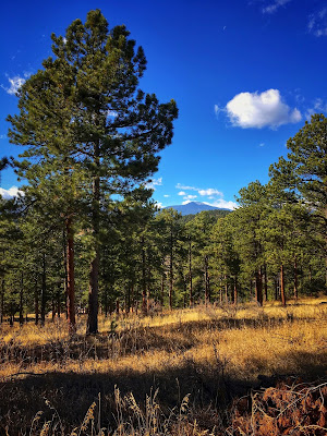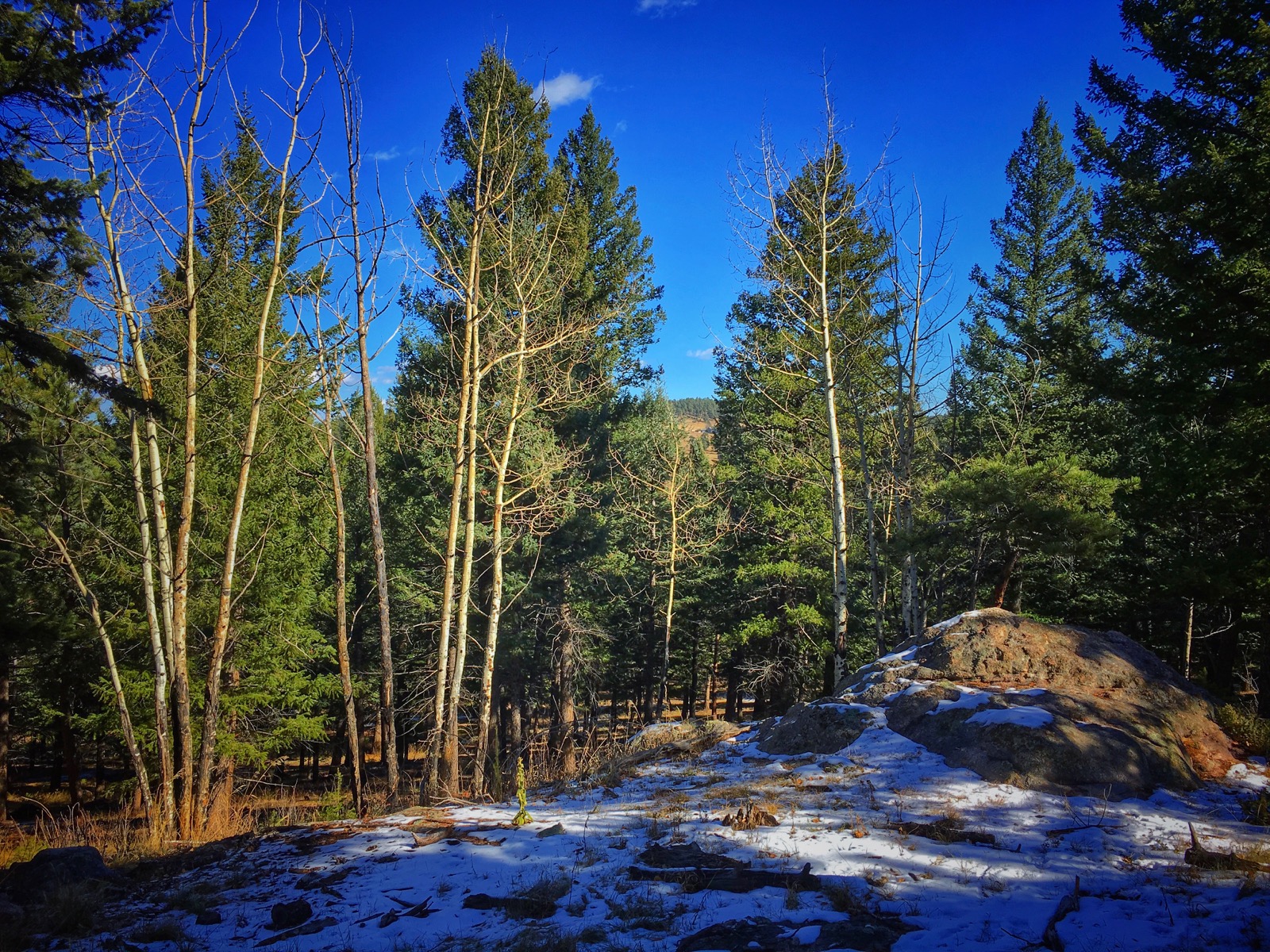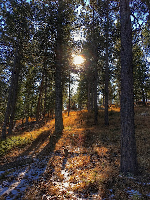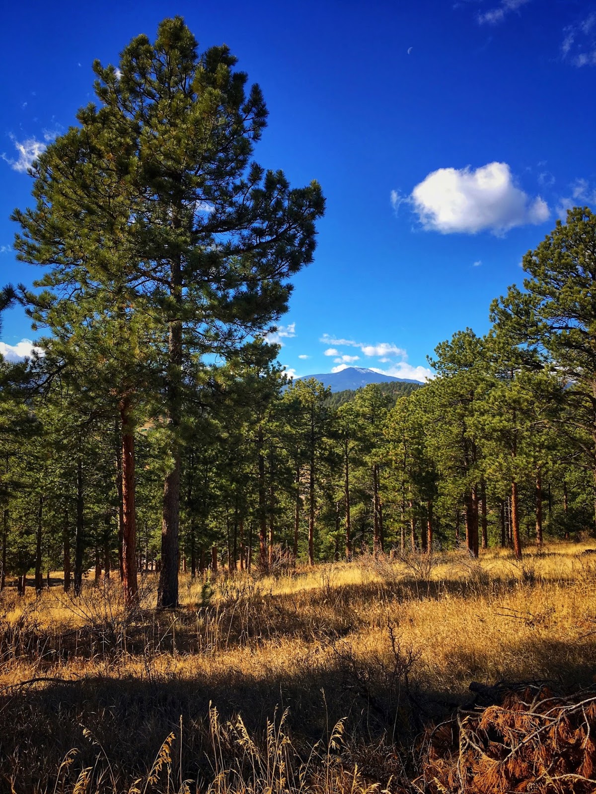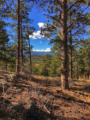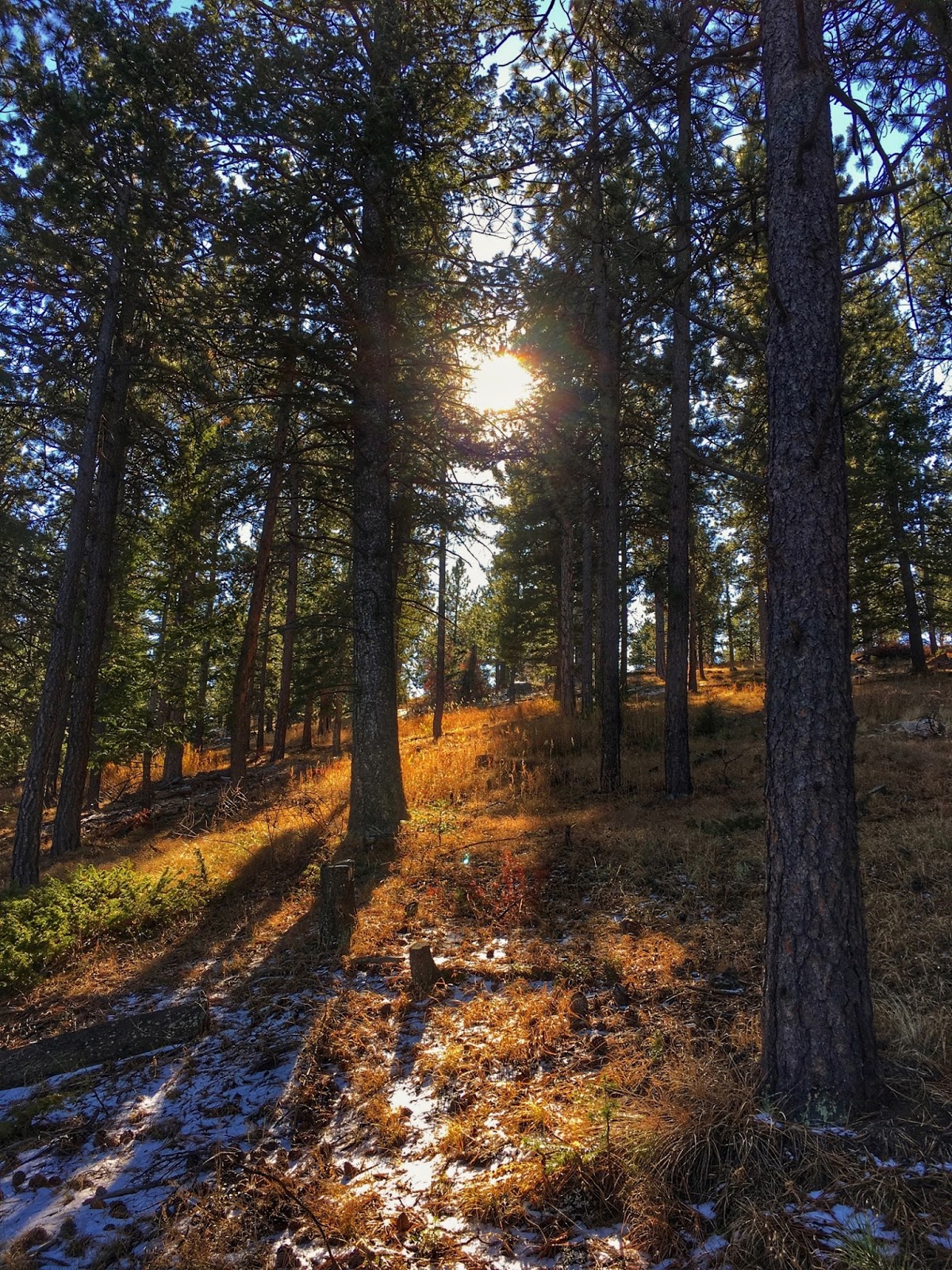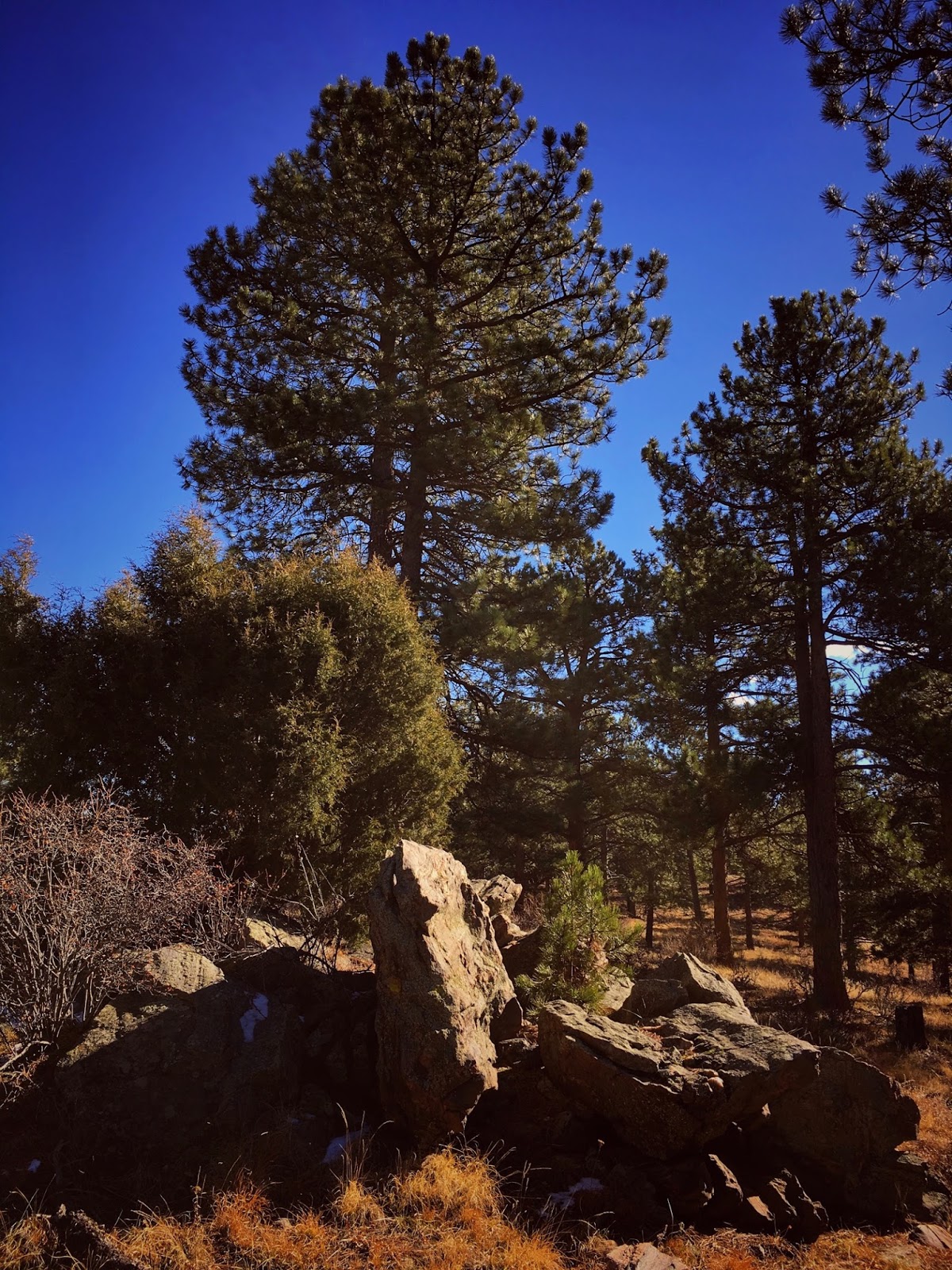 The south-facing slope is flooded with bright sunlight where the ponderosa pine are twisted above an open scrubland of yellow grasses. Out there the rocky terrain is wide open with far-reaching views that extend all the way to the Continental Divide.
