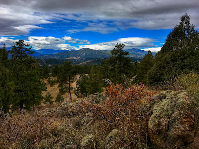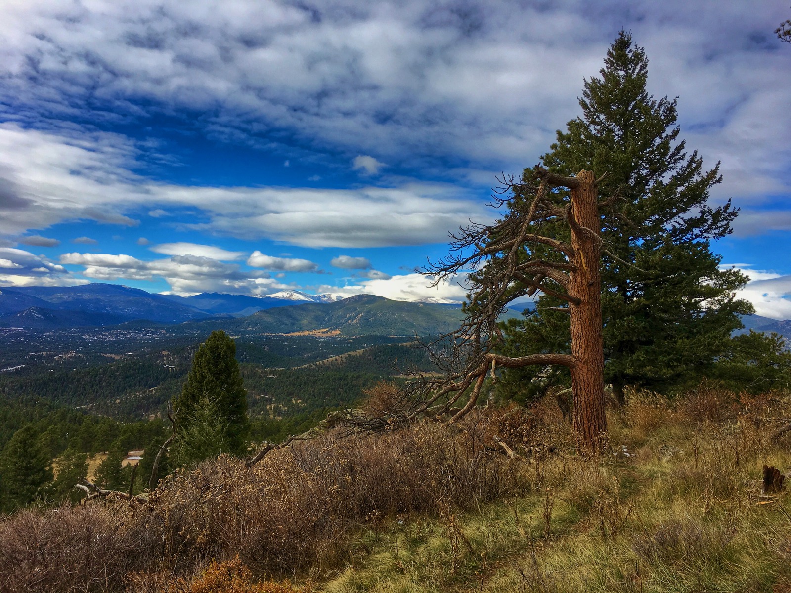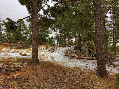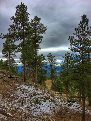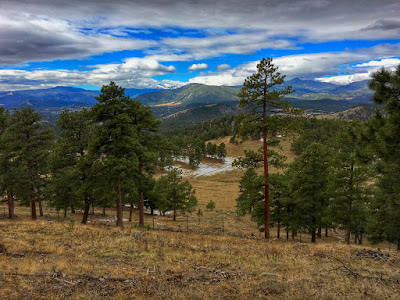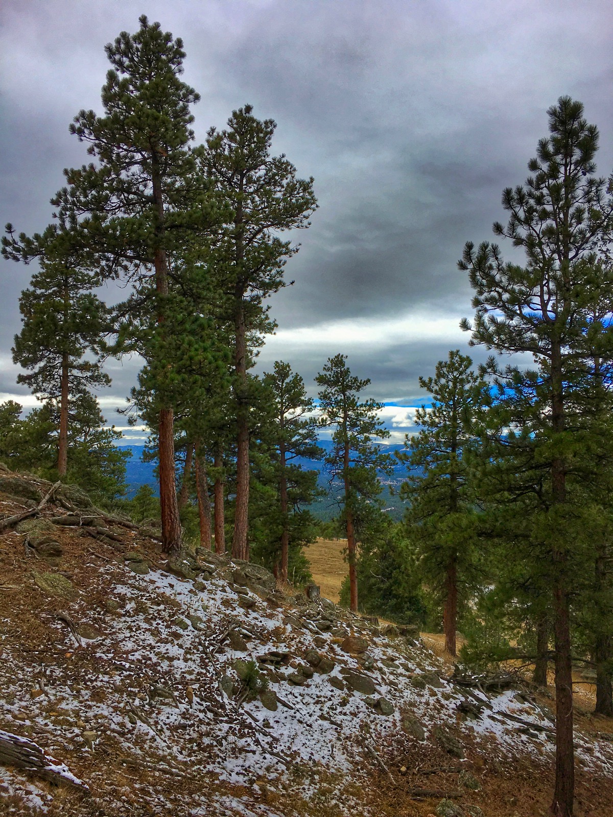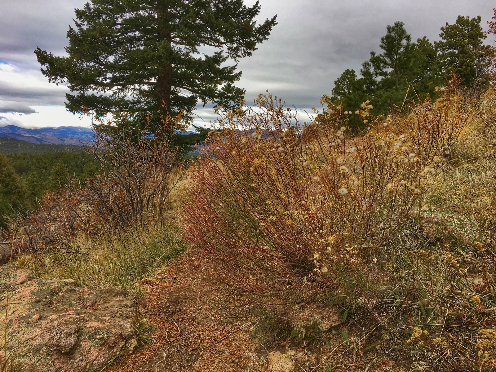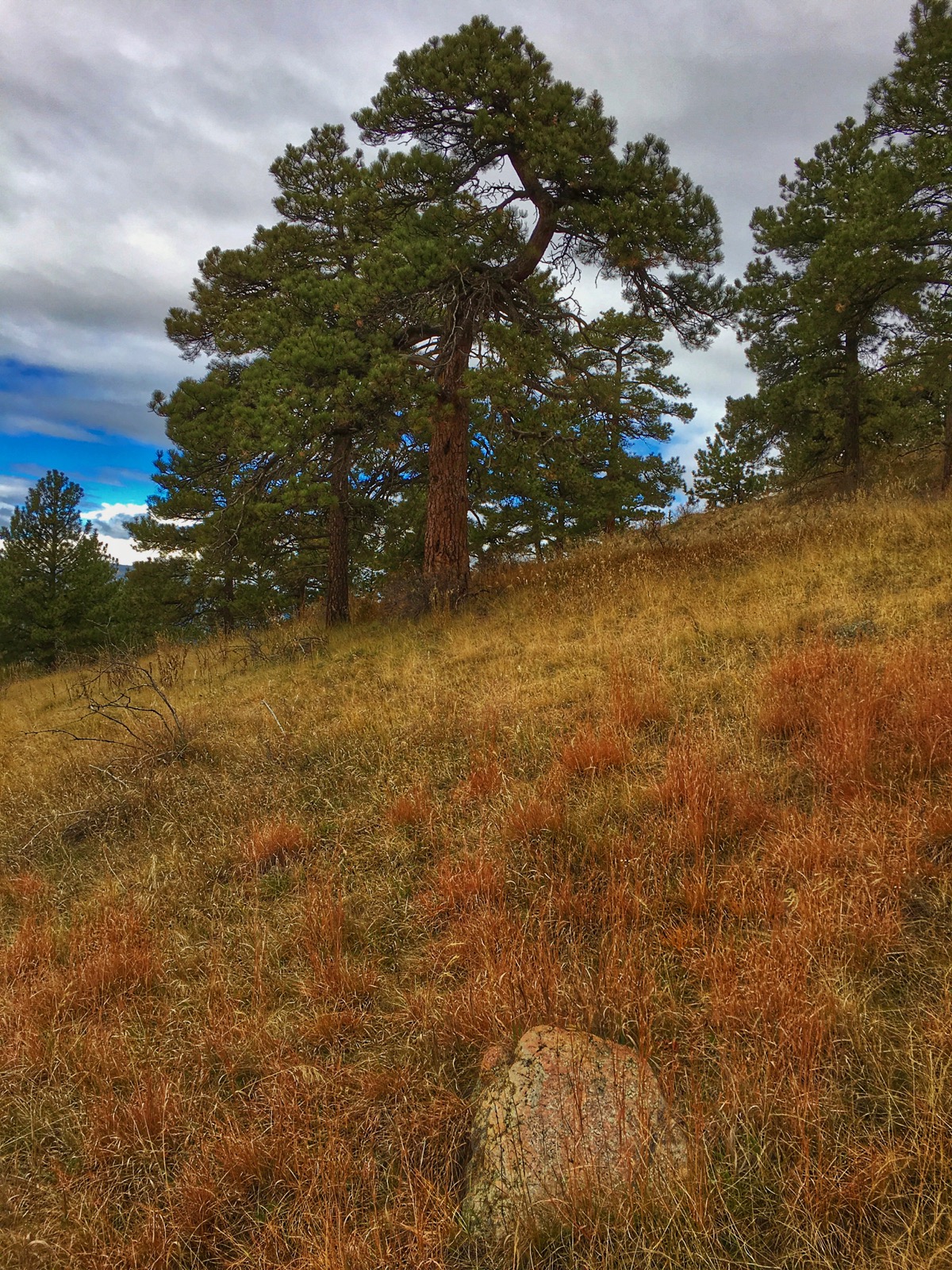 On a cold November morning the colors are dull and gray but the spectacular setting is classic Colorado foothills. The steep, grassy slopes are golden ochre and covered by an old-growth forest of ponderosa pine.