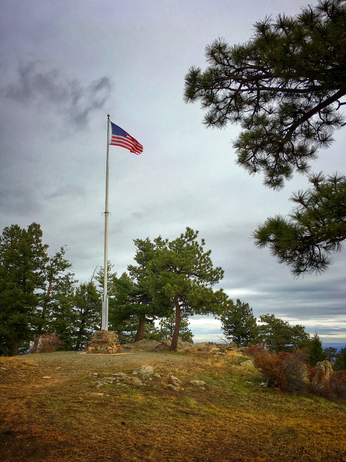 Erected at the precipice, a sturdy flagpole flys an American flag that’s tattered from the constant barrage of blowing wind. The historic guidon is a beacon of national pride and it’s determined flight is a symbol of the pioneer spirit.