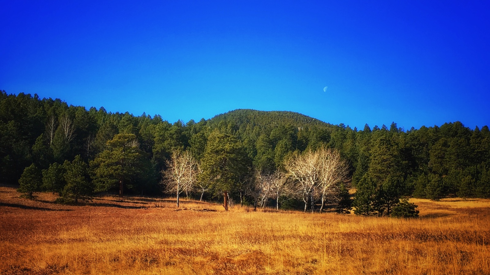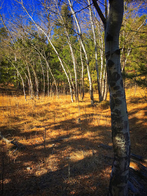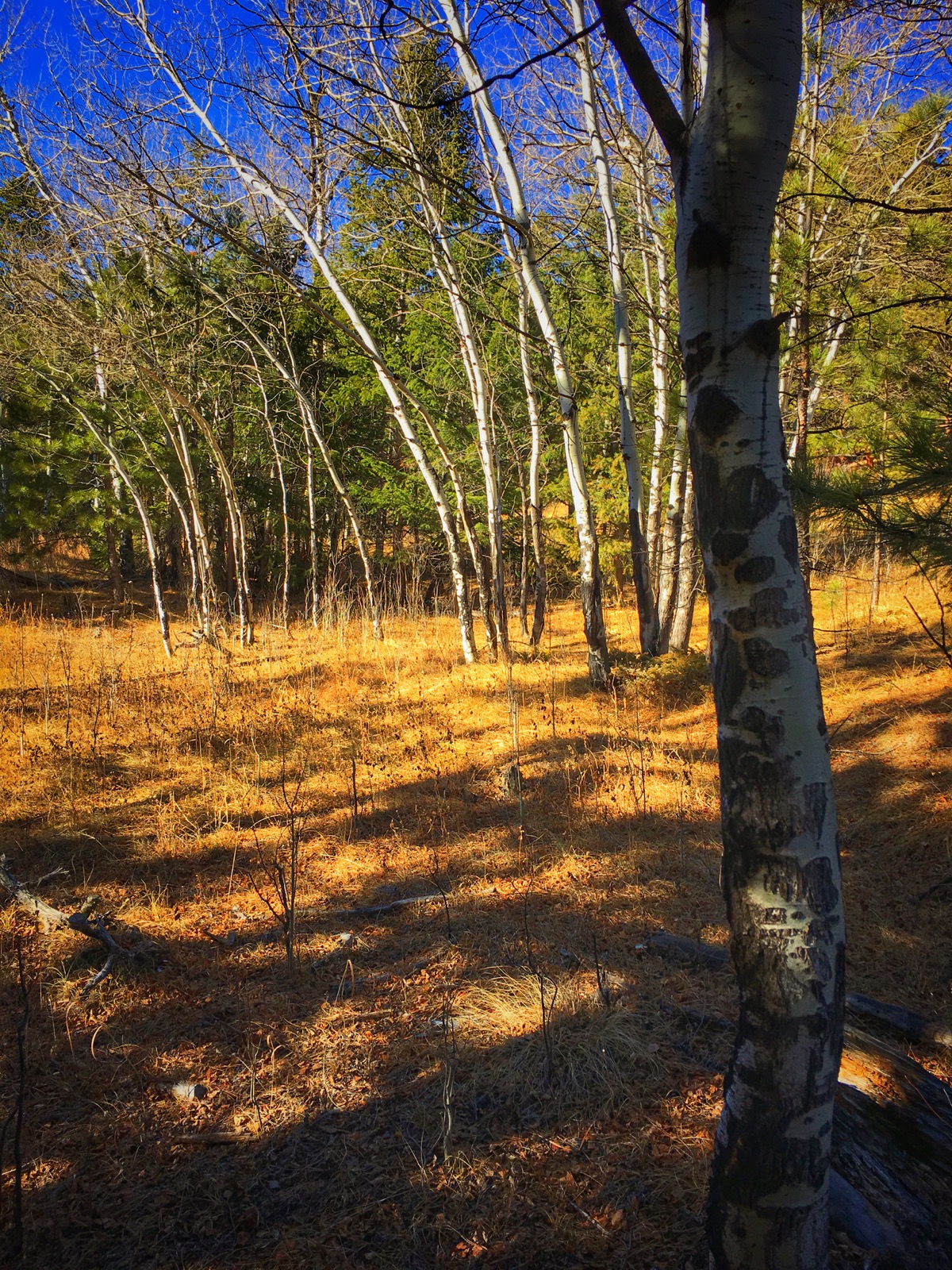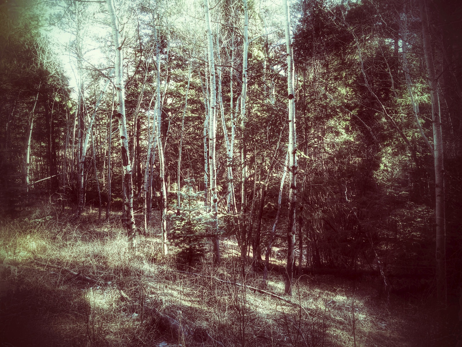 Further on, a lone rock is described with strong contrast as it’s settled on a bed of soft grass. Along the dusty trail and down into a damp drainage, a ghostly grove of aspen are an eerie niche in the dark forest.