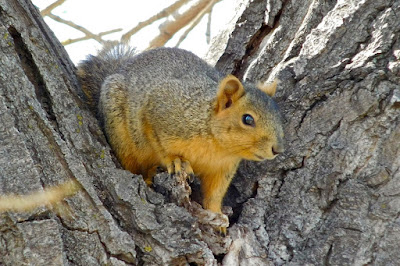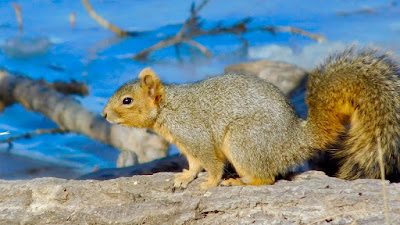 On land an eastern fox squirrel was out and about searching for something to eat during such a fine morning. Wary of strangers, he scampered up a barren tree and from a secure niche glared down at me with an annoyed scorn.