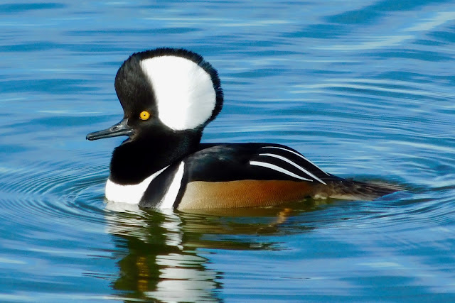 On that Saturday morning a strange looking bird was a surprise visitor that appeared suddenly onto the scene. I was lucky to observe a group of hooded mergansers, four males and one female, fishing in the frigid reservoir.