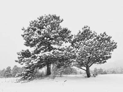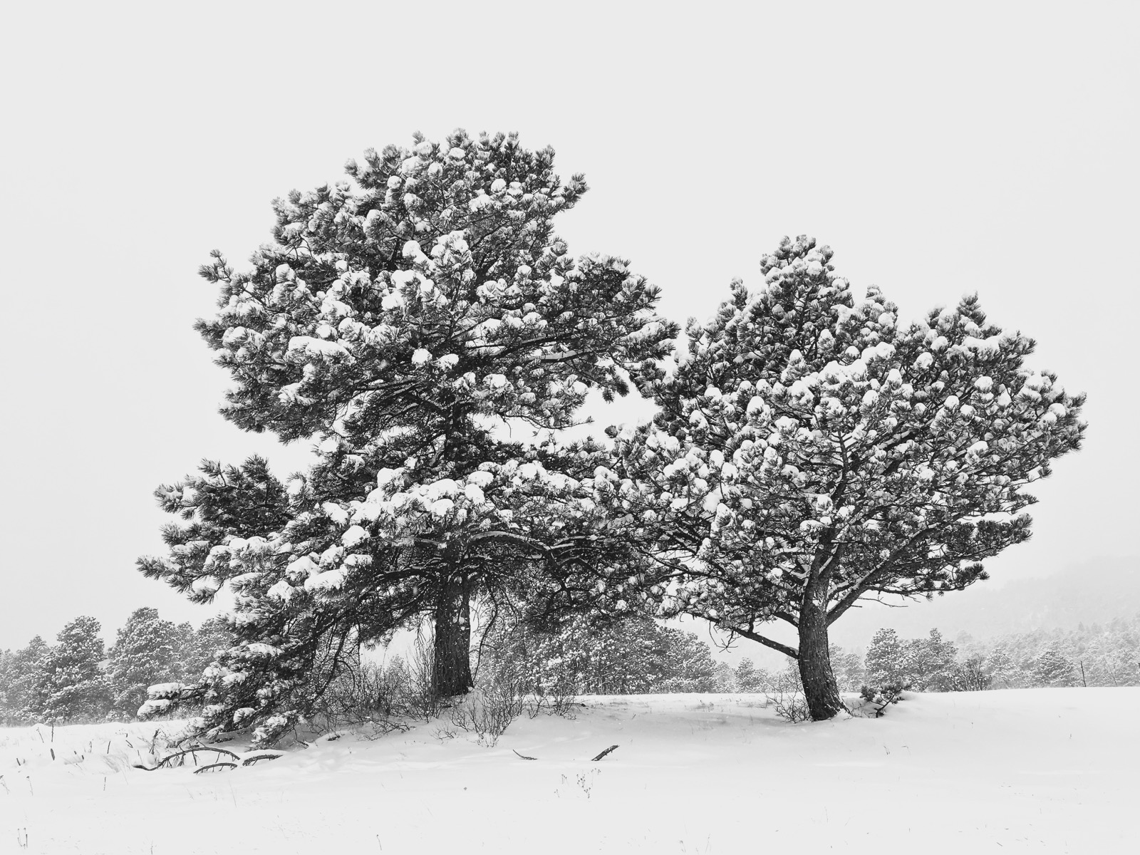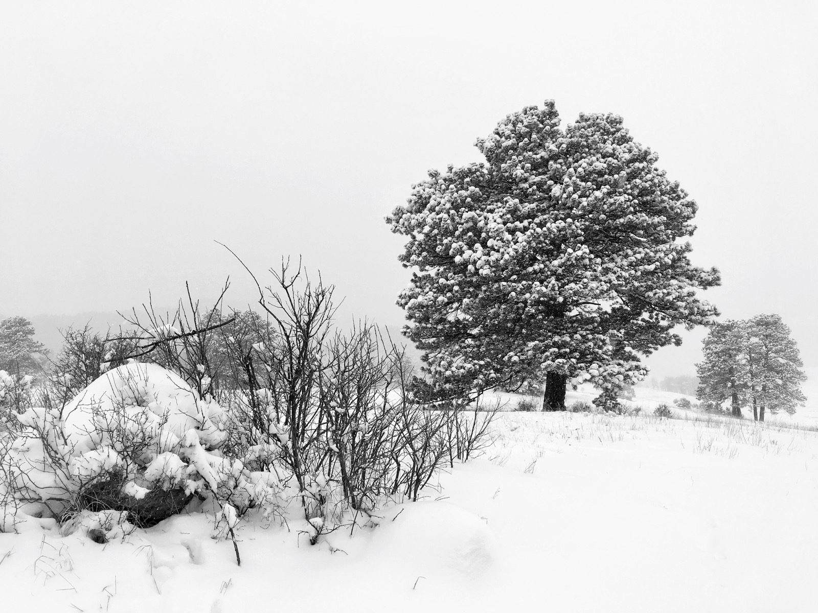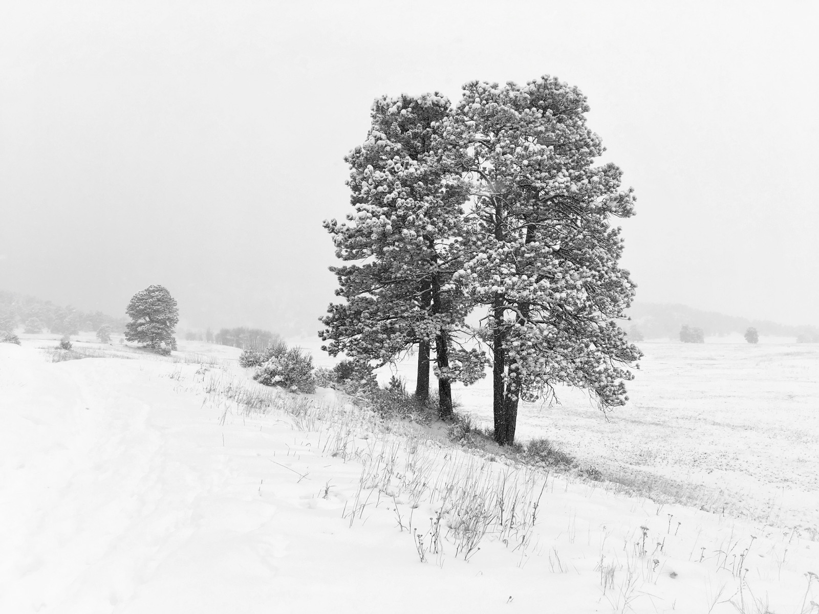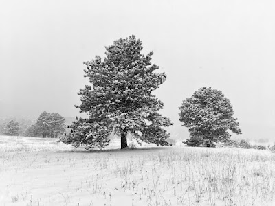 A misty atmosphere shrouded the mountains in a palette of monochrome color. With the absence of light, aerial perspective was exaggerated as scattered pine trees seemed to recede and disappear into the distance.