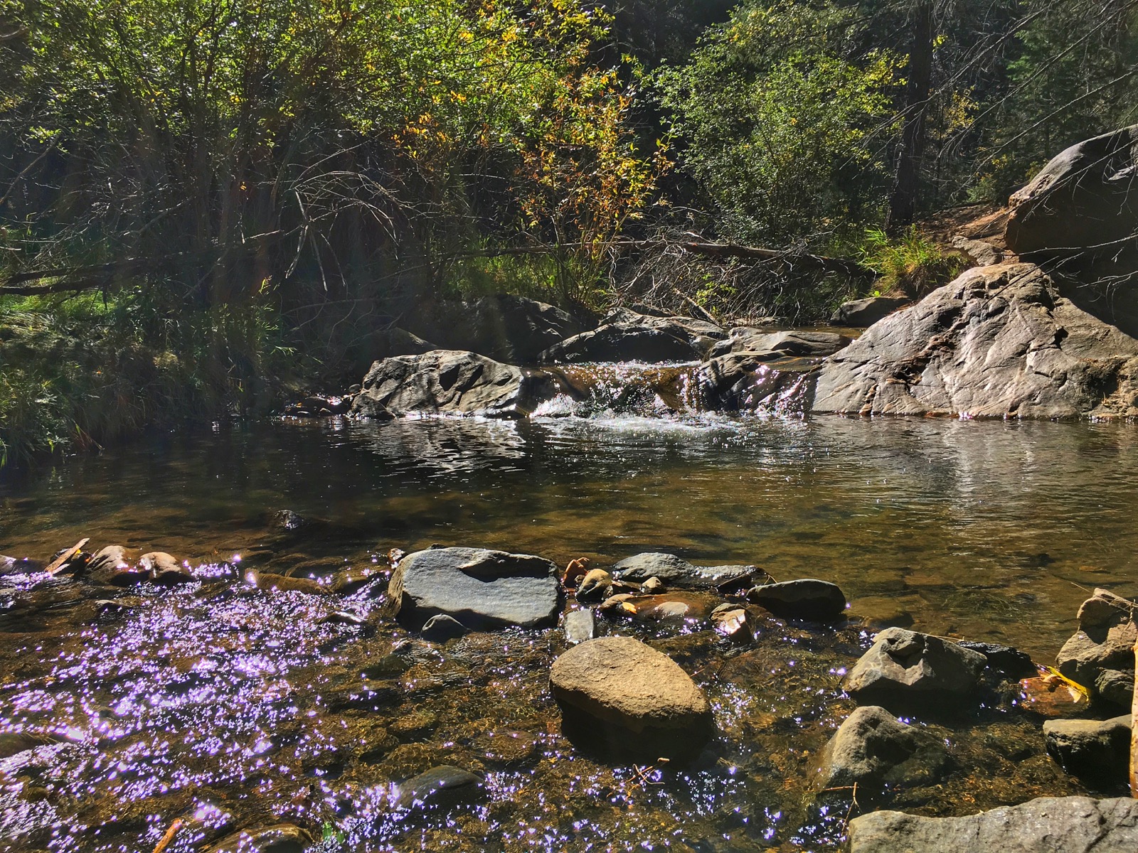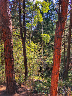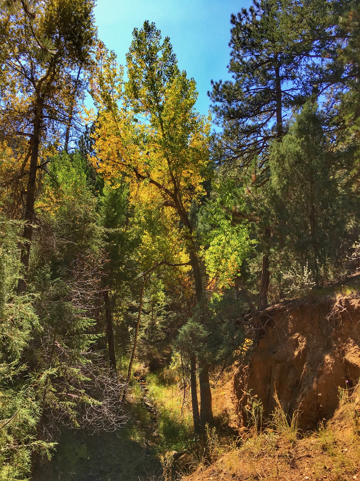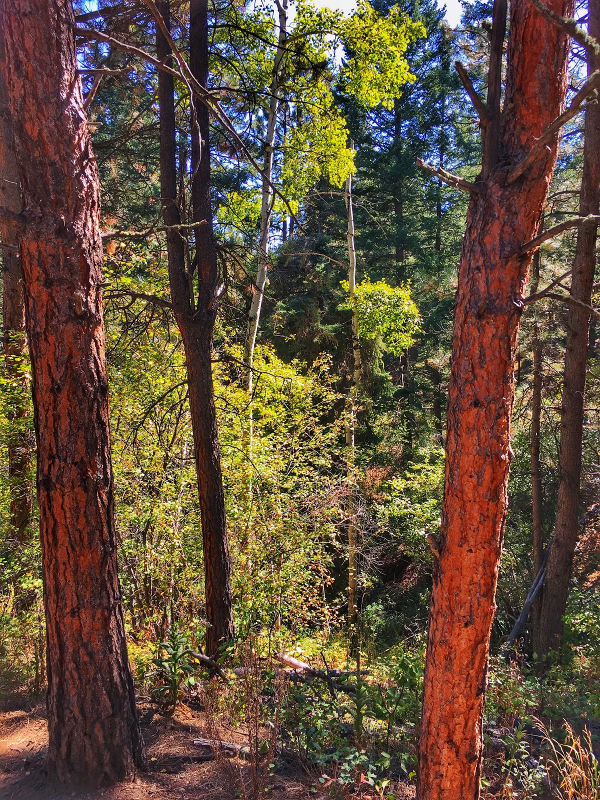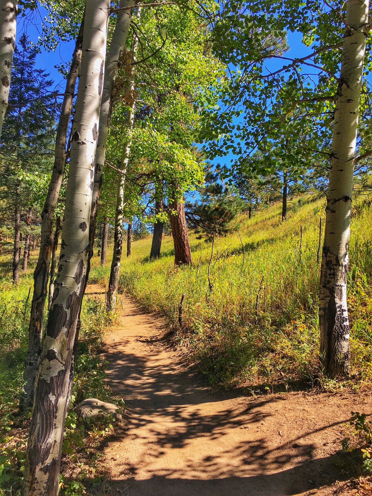 A final charge through the last leg of the arduous trek finally achieved admittance into a receptive forest. With the danger zone left in the dust, a shaft of filtered light, shining through a grove of aspen, guided the weary traveler to the glorious finish line.