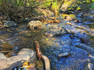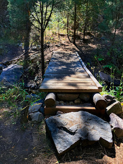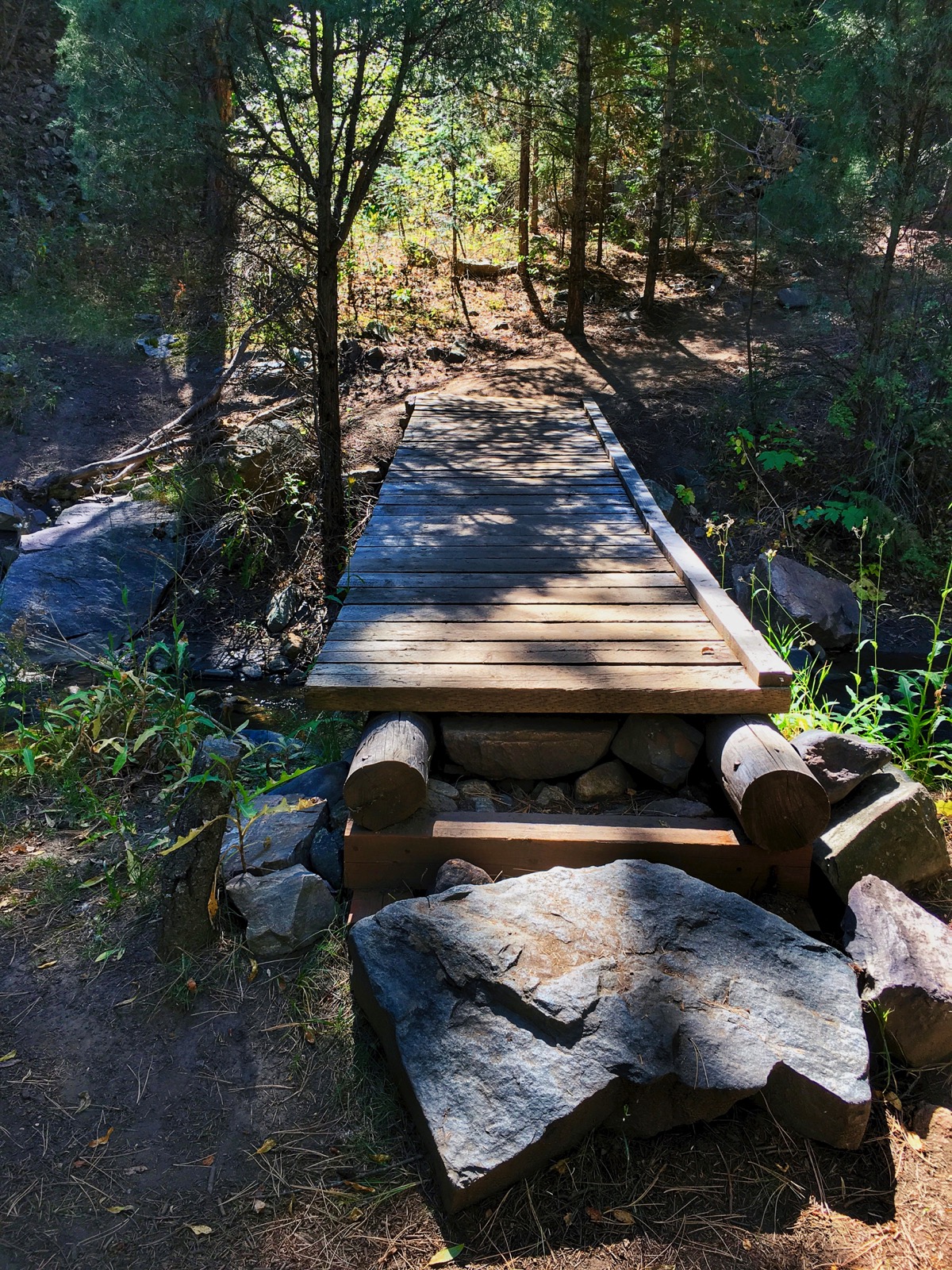 Down at the extreme bottom, a series of twenty footbridges criss-crossed the blue stream while transporting the hemmed in hiker through a picturesque portal. Down there the problems began because the thrilling scenery and ease of passage were short-lived.