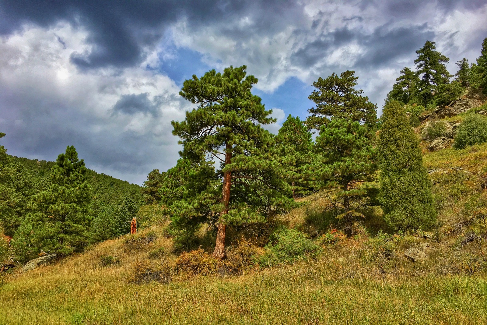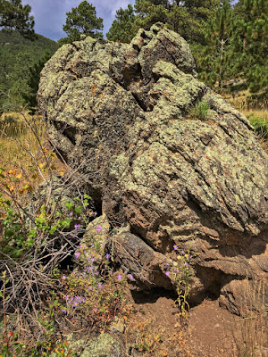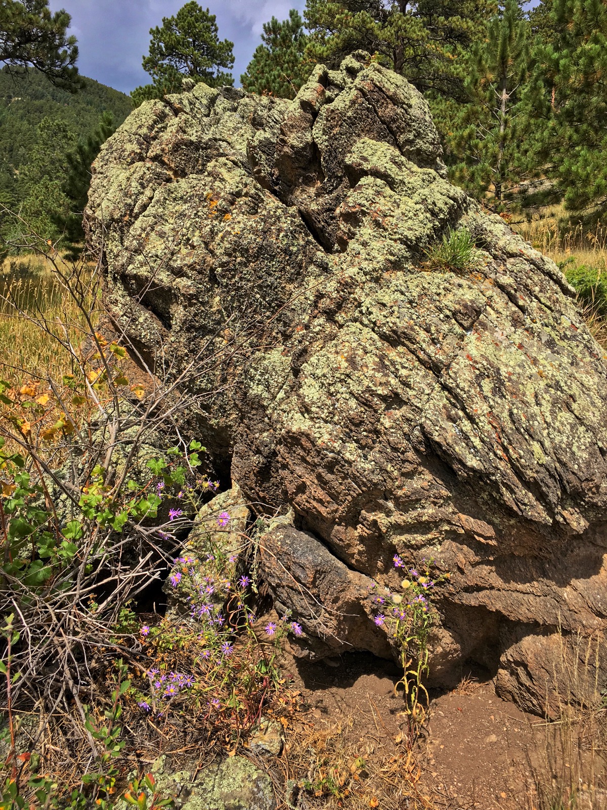 Framed by wildflowers, a big, violet boulder marks the beginning of the way up into golden foothills. Around the bend, a slope of mixed vegetation leads to a broken ridge and the blue storm clouds beyond.