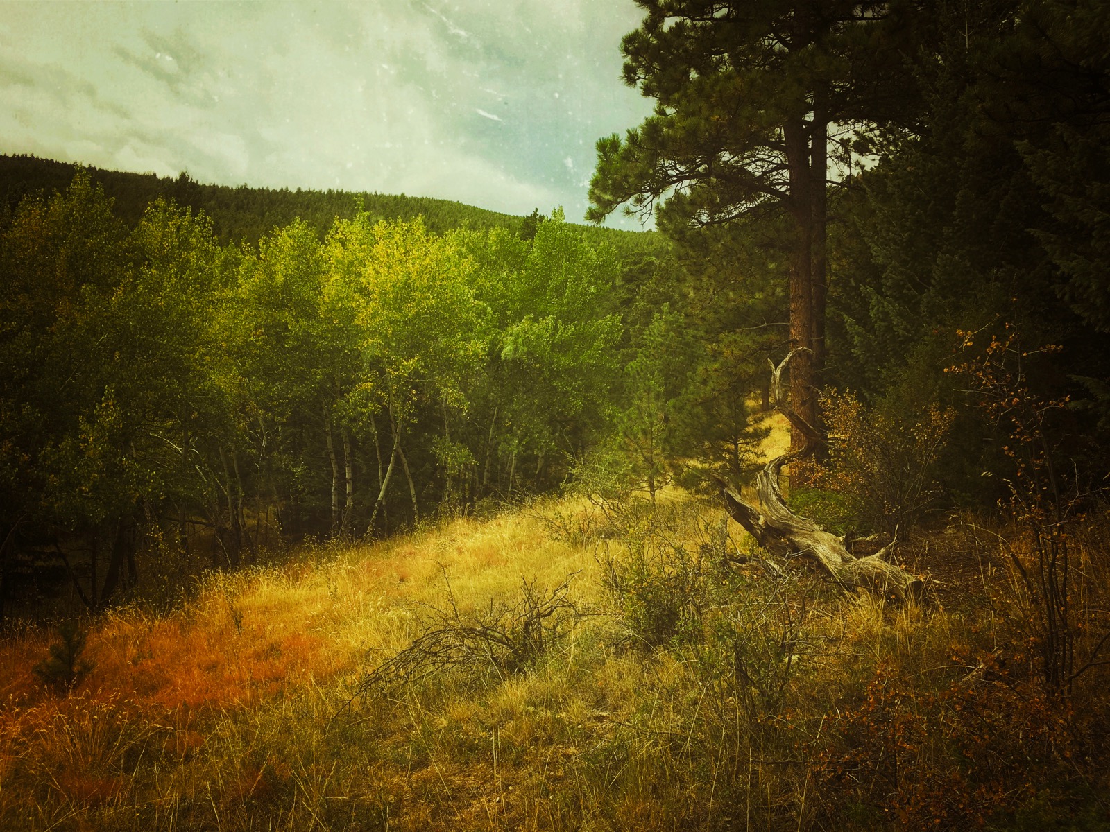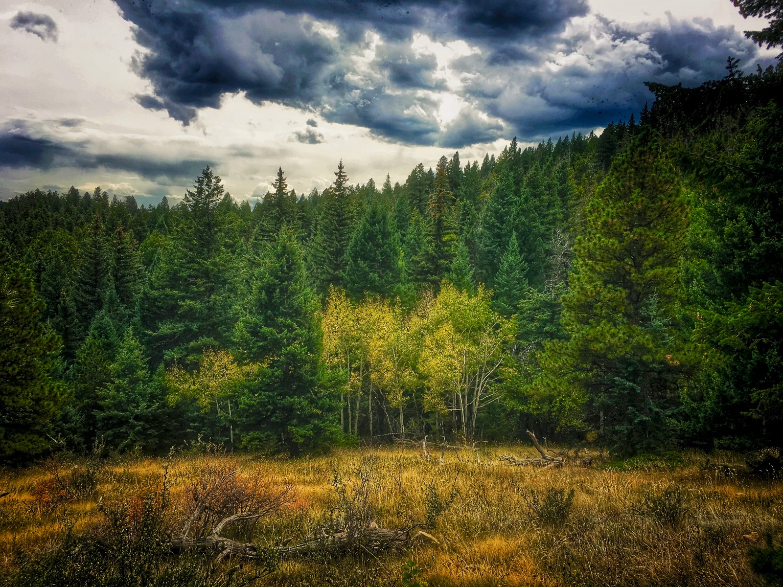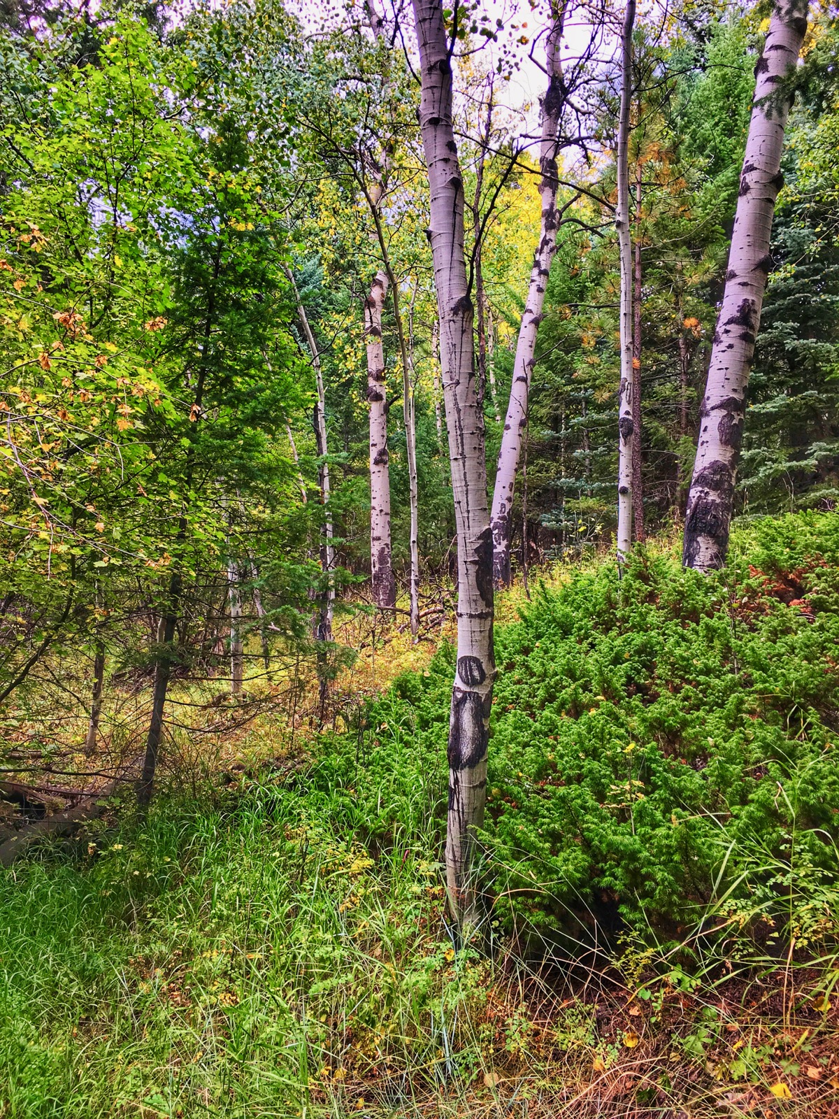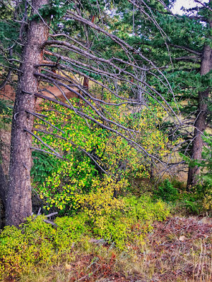 The first hint of fall is a surreal splattering of yellow leaves below a pine bough of arched and broken branches. In the low light, a grove of turning aspen seems to glow when set against the coniferous forest.